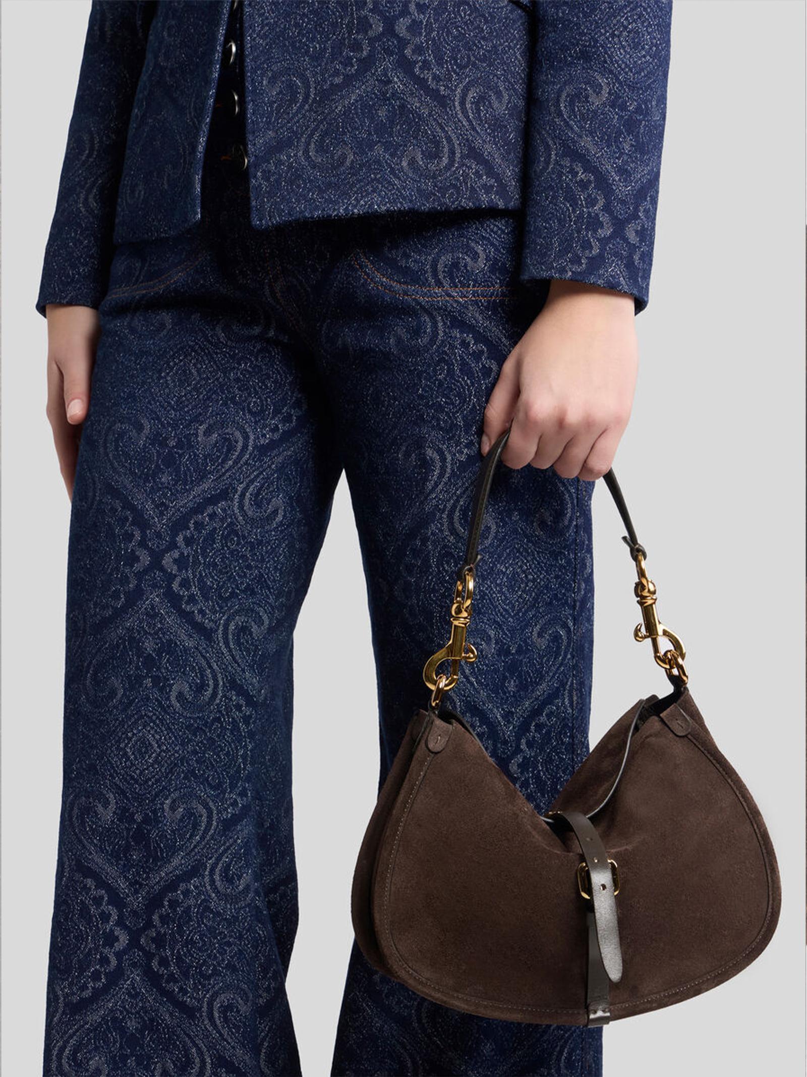 Borsa Pony marrone dalle linee morbide realizzata in suede tinta unita con interno in pelle liscia. Presenta una doppia chiusura: quella principale con bottone magnetico decorato dal logo ETRO e Pegaso incisi con la stessa tecnica della coniatura delle monete, e quella secondaria con fibbia metallica funzionale. Il modello include manico e tracolla intercambiabili con dettaglio Paisley in corrispondenza dei moschettoni, tasca interna a parete e accessori metallici con finitura dorataDimensioni (Larghezza, Altezza, Profondità): 29 x 20 x 10 cmComposizione: PELLE BOVINADettagli: PELLE DI VITELLOMade in Italy