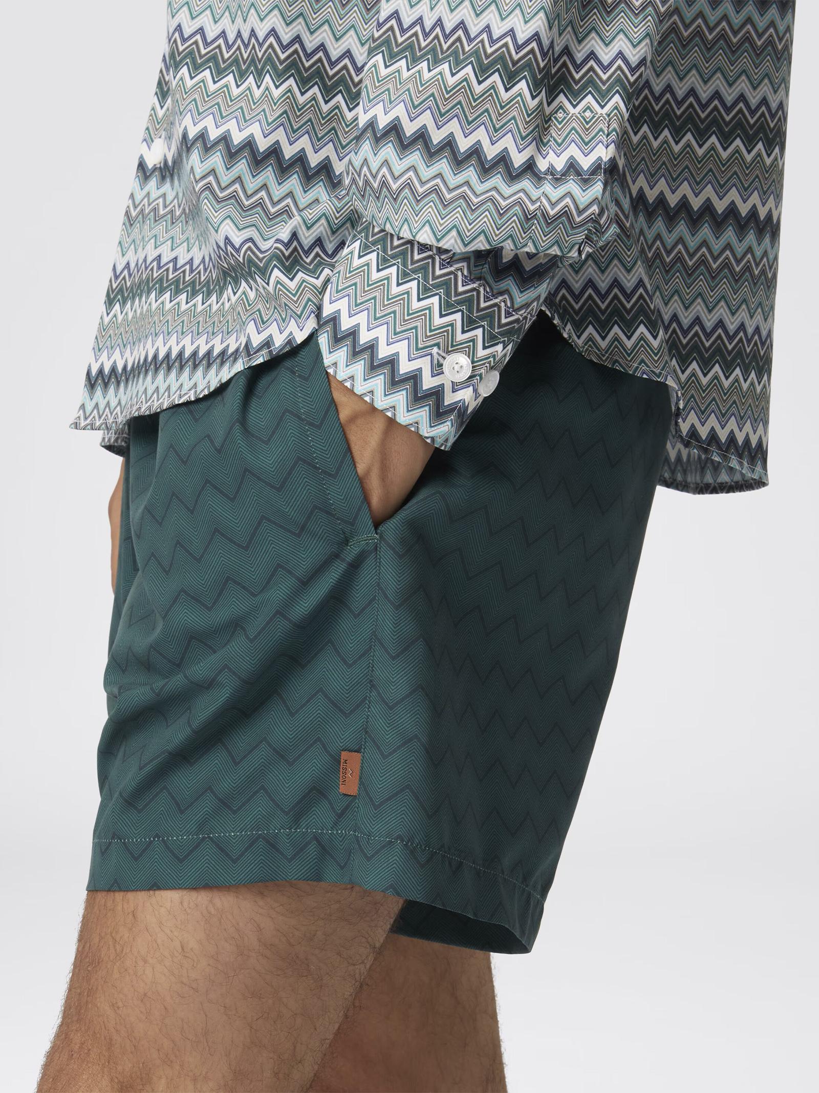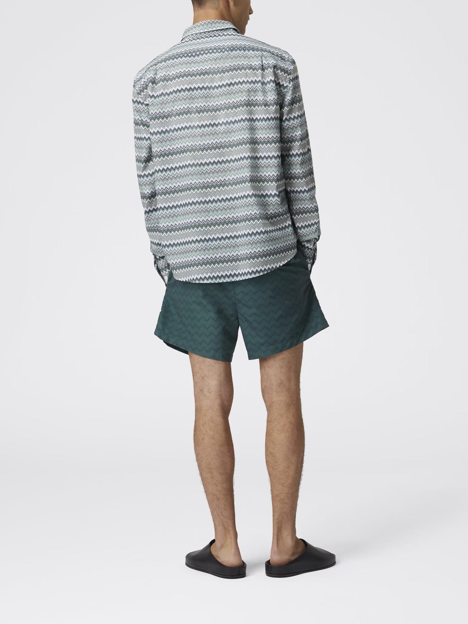 Boxer da mare in nylon verde con motivo zig zag tono su tono. L'equilibrio tra la semplicità del design e la complessità del motivo zig zag crea un capo discreto ma d'impatto, ideale per chi cerca uno stile raffinato anche al mare.Istruzioni per il lavaggio: Non lavare a secco; Non stirare; Lavare delicatamente max 30°C; Non trattare con cloro; Non usare asciugatrice.Composizione: PRINCIPALE: 100% POLIESTERE; Fodera: 100% POLIESTEREMade in Tunisia