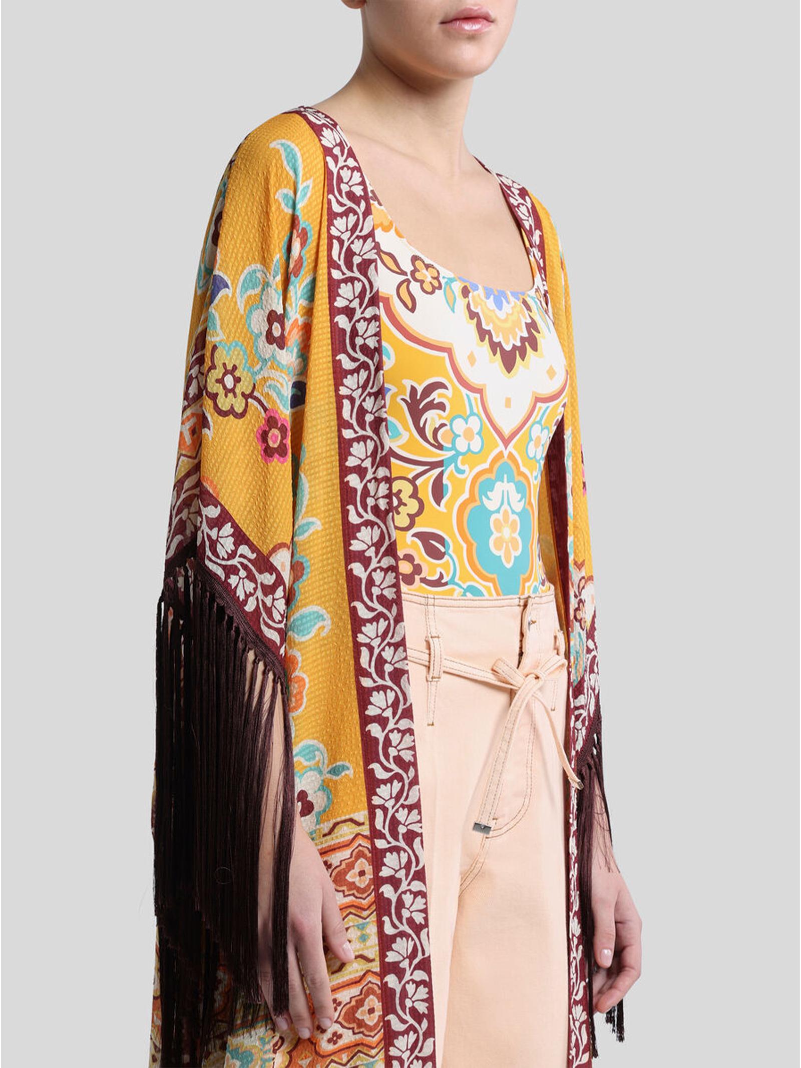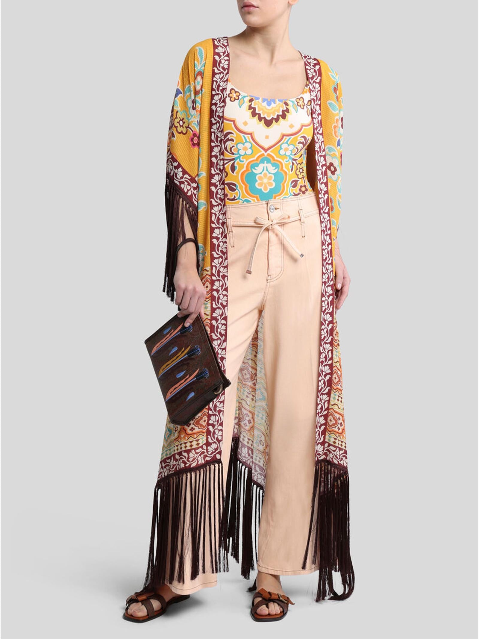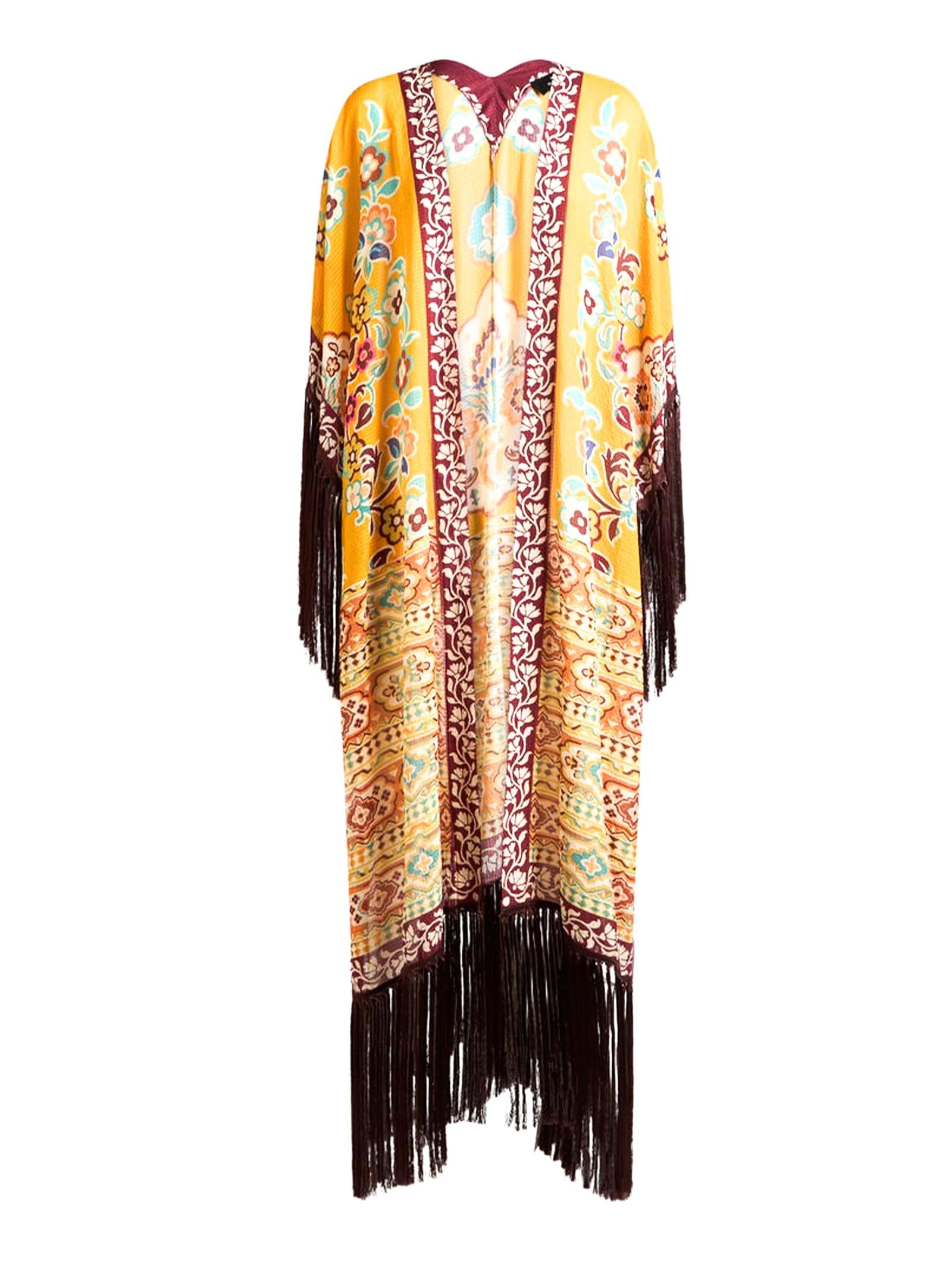 Caftano lungo senza chiusura contraddistinto da una stampa floreale piazzata. Il modello è decorato con lunghe frange a contrasto effetto macramé. Presenta una vestibilità over e maniche ampie.Composizione: 100% POLIESTEREFrange: 100% VISCOSAMade in Italy