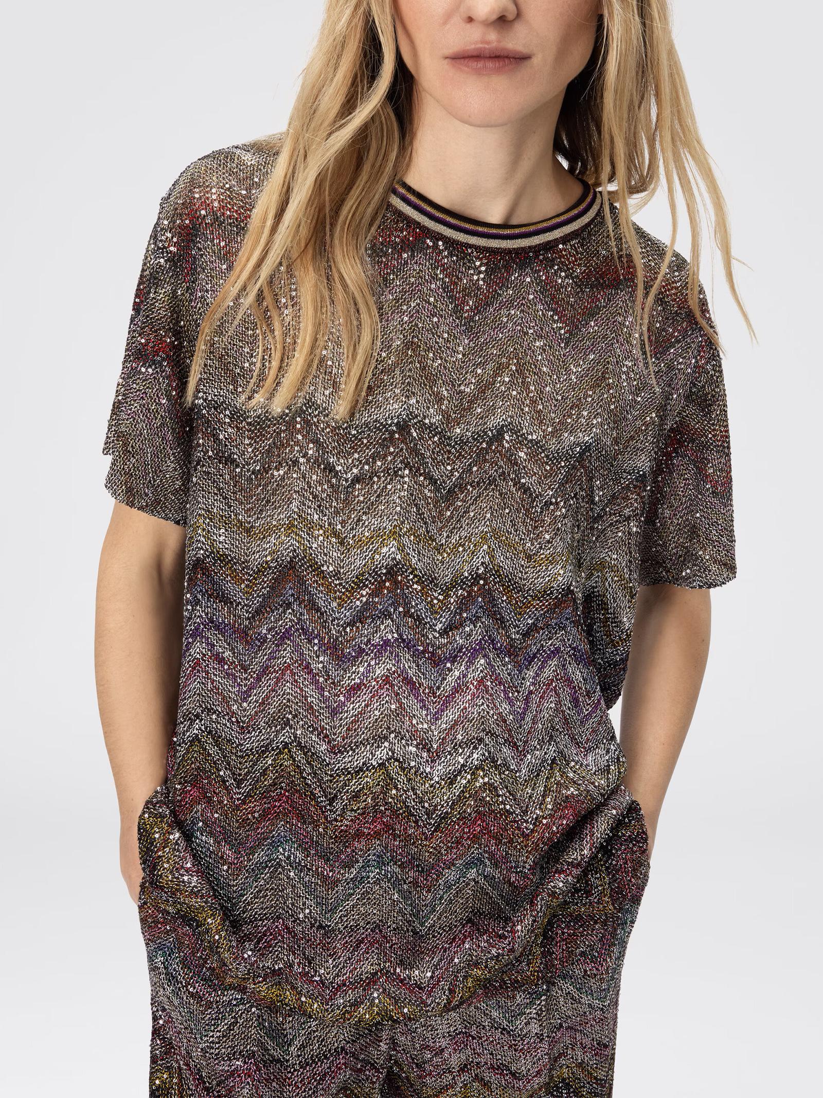 T-shirt in viscosa a manica corta da donna dal carattere luminoso e sofisticato, realizzata su telaio Caperdoni con l'iconico motivo zig zag tipico di Missoni. I filamenti lamé e le paillettes delicate donano al capo una brillantezza discreta, perfetta per elevare anche i look più minimal con un tocco di luce.Istruzioni per il lavaggio: Non lavare, lavare delicatamente a secco in tetracloroetilene, asciugare in piano, stirare solo con vapore, non trattare con cloro, non stirare, non usare asciugatrice.Composizione: Principale: 48% VISCOSA, 46% POLIAMMIDE, 6% FIBRA METALLIZATAMade in Italy