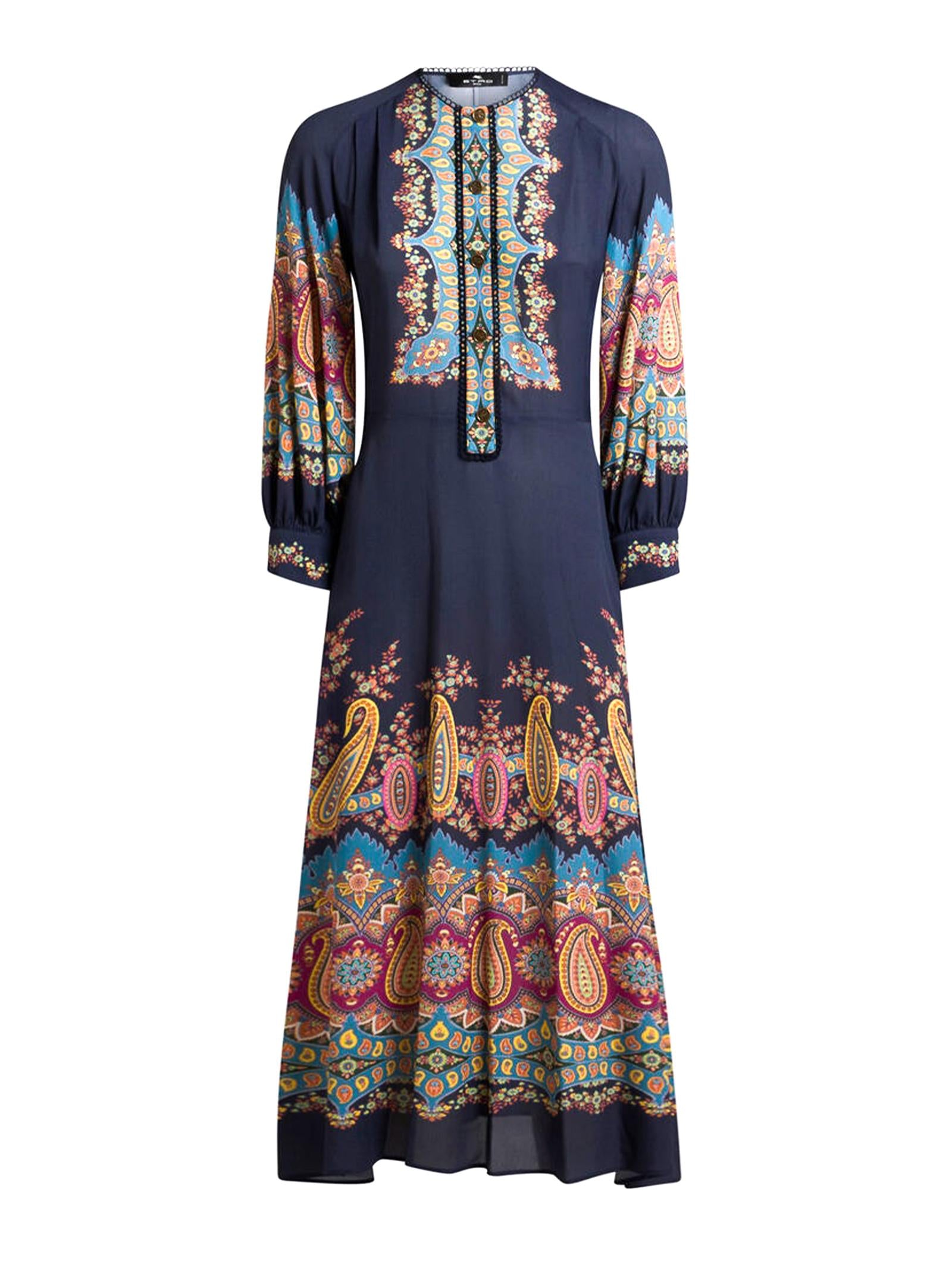 Abito midi girocollo dalla vestibilità regolare realizzato in crêpe de Chine con stampa Paisley floreale piazzata. Si distingue per i dettagli plissettati, le maniche lunghe a palloncino e le finiture con passamaneria a contrasto. Completano il capo i bottoni metallici con Pegaso in rilievo della chiusura frontale.Composizione: 100% VISCOSAPassamaneria: 85% COTONE, 15% POLIESTEREMade in Italy