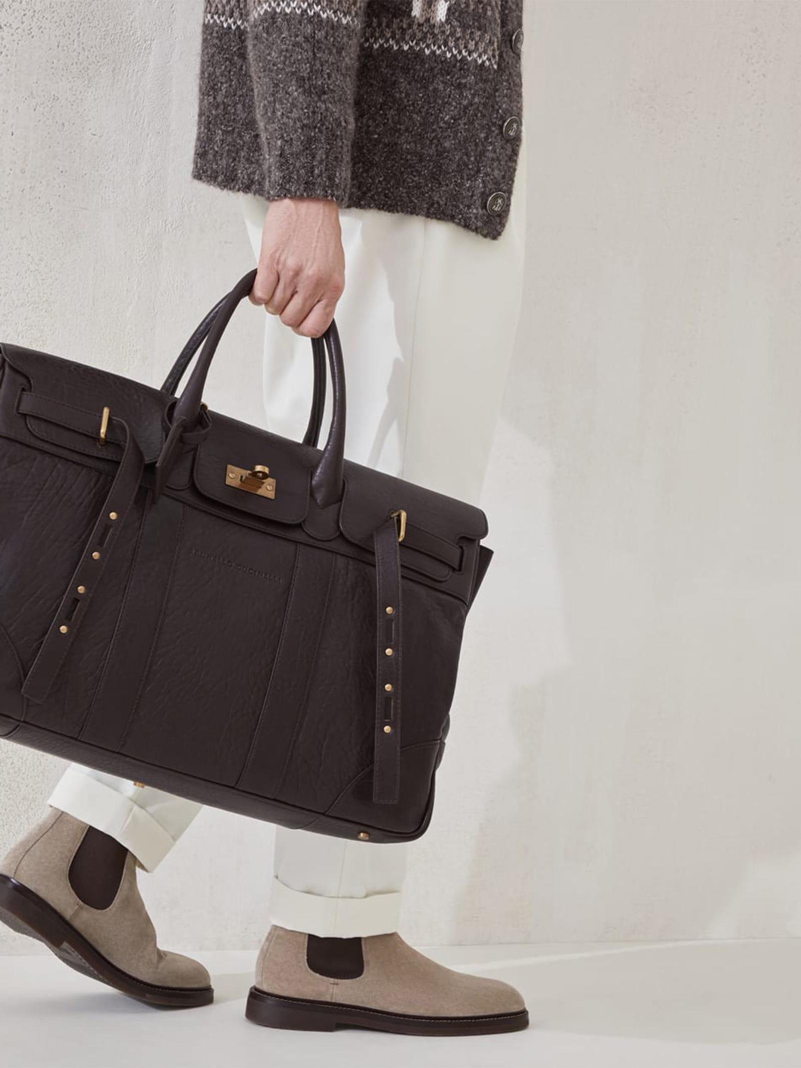 Materiali di pregio e attitudine versatile definiscono il fascino della borsa Country, ideale per una breve fuga dalla città o un fine settimana di relax. La particolare superficie granata e irregolare della pelle di vitello Texture è ottenuta grazie ad attente lavorazioni artigianali e rifinita a mano con dettagli unici. Dotata di un pratico manico doppio, è completata all'interno da uno scompartimento aperto e da una tasca con zip.La pelle di vitello viene lavorata con una tecnica particolare che caratterizza la superficie con una texture a rilievo geometrica e regolare simile a quella dei palloni da basket. Le finiture effettuate a mano creano effetti di chiaroscuro che arricchiscono l'aspetto ricercato dell'accessorio, foderato in tessuto idrorepellente per proteggere il contenuto dall'eventuale contatto con l'acqua. Presenta inoltre chiusura con patta dotata di piolino, tasca interna per documenti e targhetta removibile per nome. Tutte le parti in metallo sono Nickel-freeDimensioni: La borsa misura circa 58 cm in lunghezza, 50 cm in altezza e 25 cm in larghezzaComposizione: 100% PELLE DI VITELLOMade in Italy