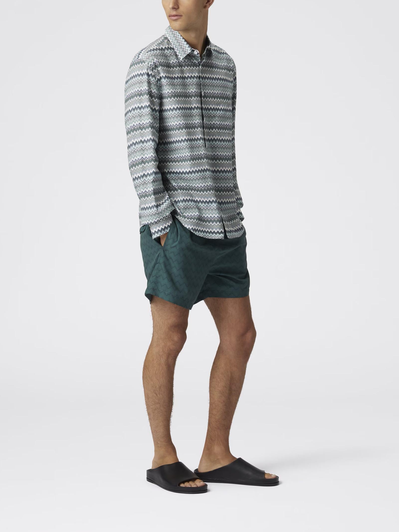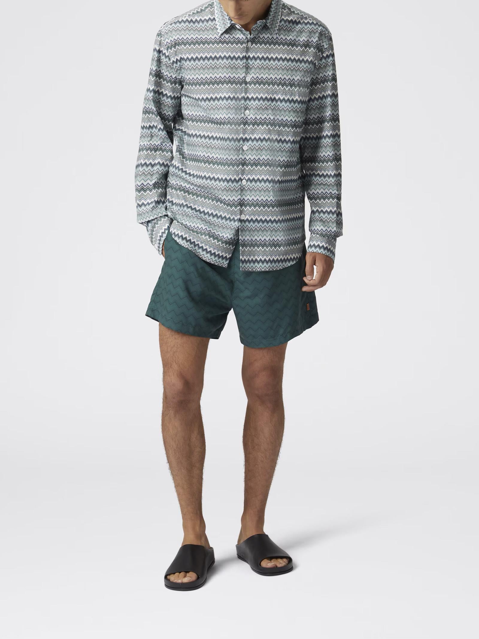 Boxer da mare in nylon verde con motivo zig zag tono su tono. L'equilibrio tra la semplicità del design e la complessità del motivo zig zag crea un capo discreto ma d'impatto, ideale per chi cerca uno stile raffinato anche al mare.Istruzioni per il lavaggio: Non lavare a secco; Non stirare; Lavare delicatamente max 30°C; Non trattare con cloro; Non usare asciugatrice.Composizione: PRINCIPALE: 100% POLIESTERE; Fodera: 100% POLIESTEREMade in Tunisia