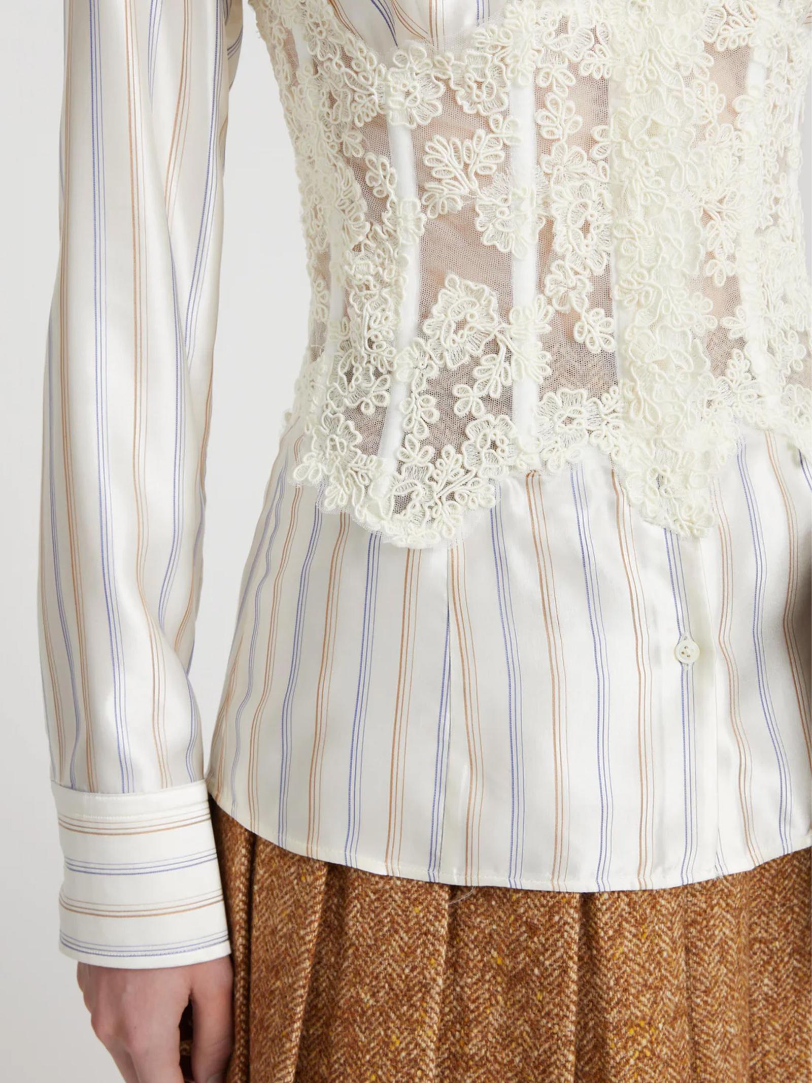Camicia realizzata in pura seta con una delicata stampa a microrighe multicolor, è impreziosita da un bustier effetto corsetto in pizzo rebrodé montato su tulle, che valorizza il motivo floreale con un suggestivo gioco di trasparenze. Il disegno del pizzo è un'esclusiva creazione della maison Ermanno Scervino, a testimonianza di una maestria artigianale unica.Presenta colletto classico e chiusura frontale con bottoni.Composizione: 100% SETAMade in Italy