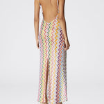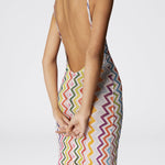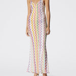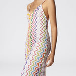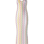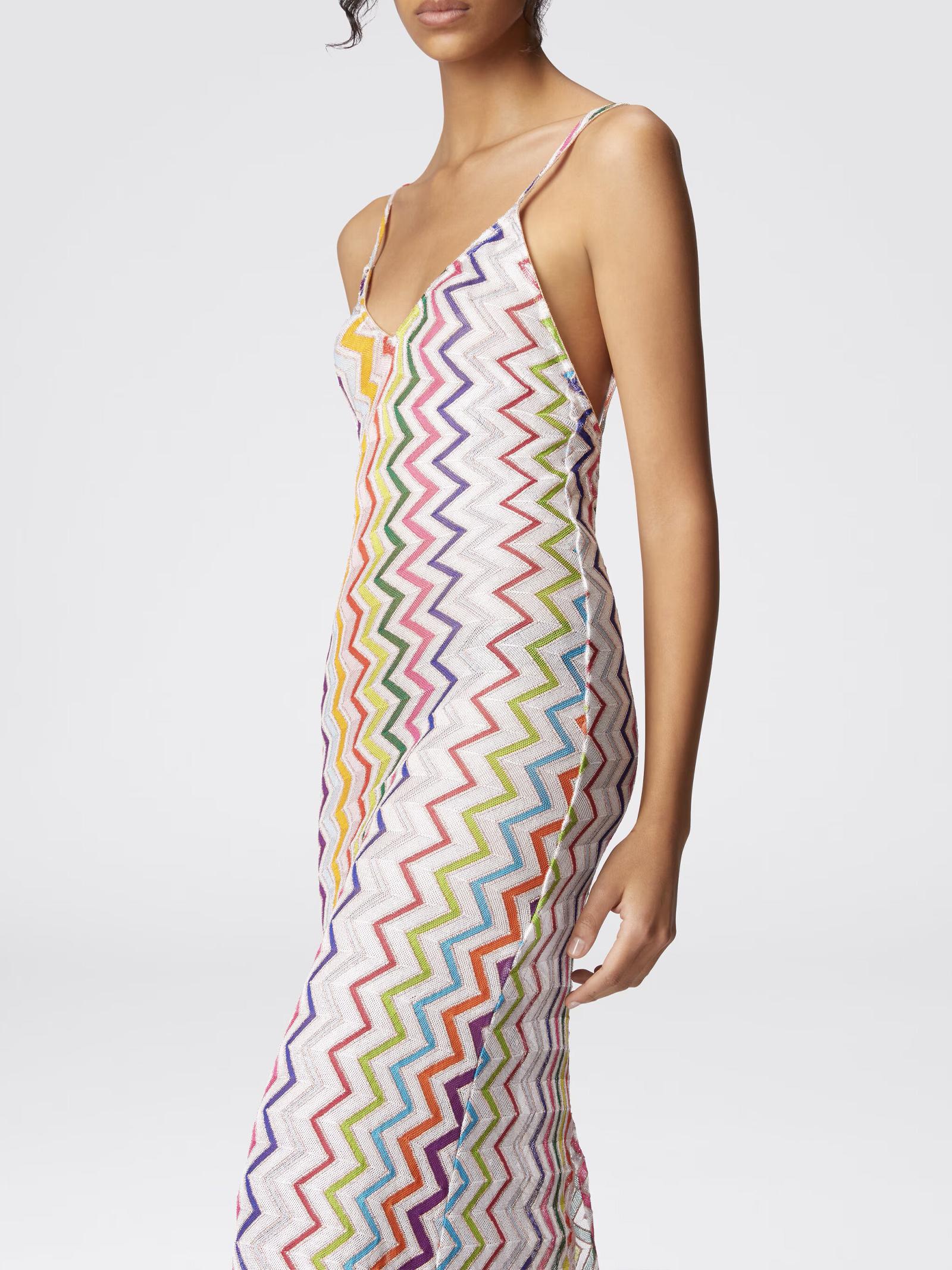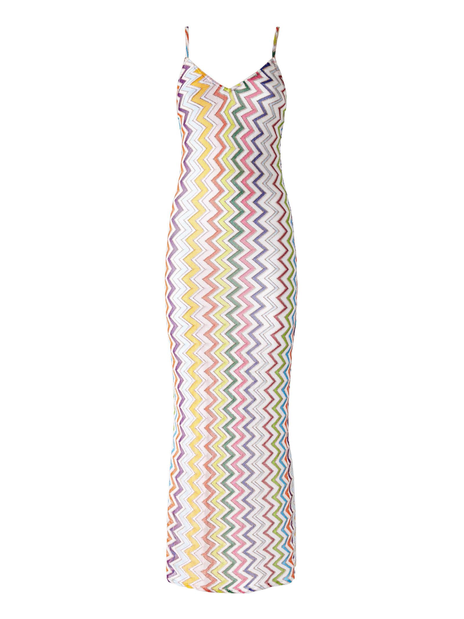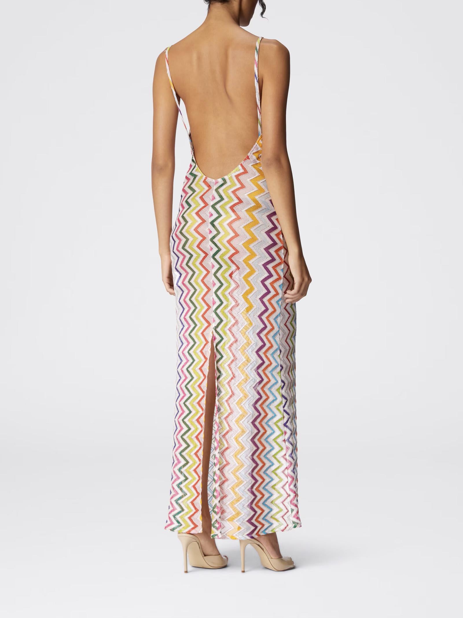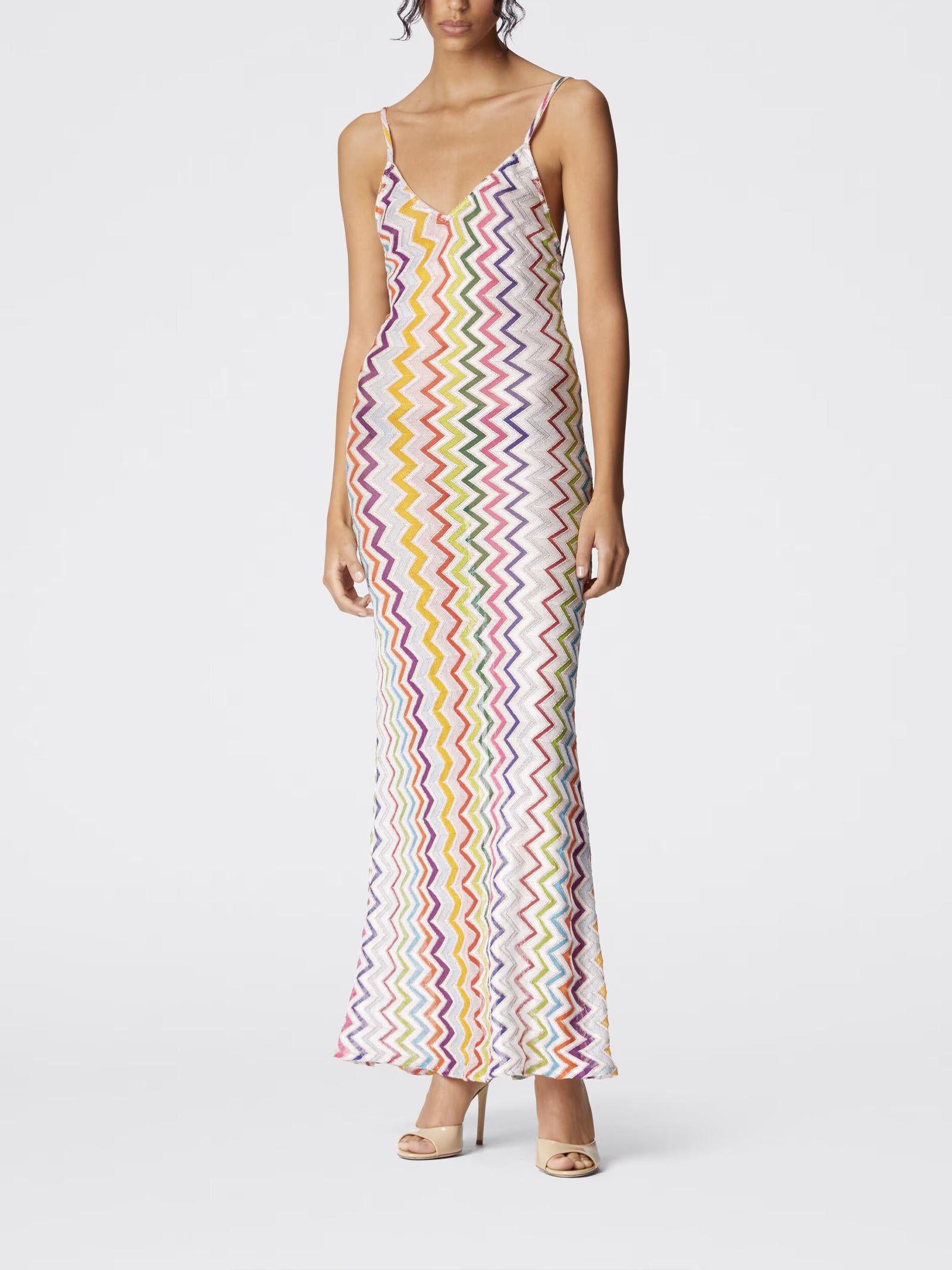 Copricostume lungo, in stile tubino, dall'eleganza minimalista presenta il classico motivo a zig zag di Missoni, spalline sottili e una profonda scollatura sulla schiena. Lo spacco posteriore sulla gonna completa il design, offrendo un movimento fluido e un tocco di sensualità.Istruzioni per il lavaggio: Non lavare; Stirare a temperatura massima 110 °C; Lavare a secco in tetracloroetilene; Non trattare con cloro; Non usare asciugatrice.Composizione: 60% VISCOSA, 25% POLIESTERE, 15% FIBRA METALLIZZATAMade in Italy