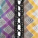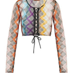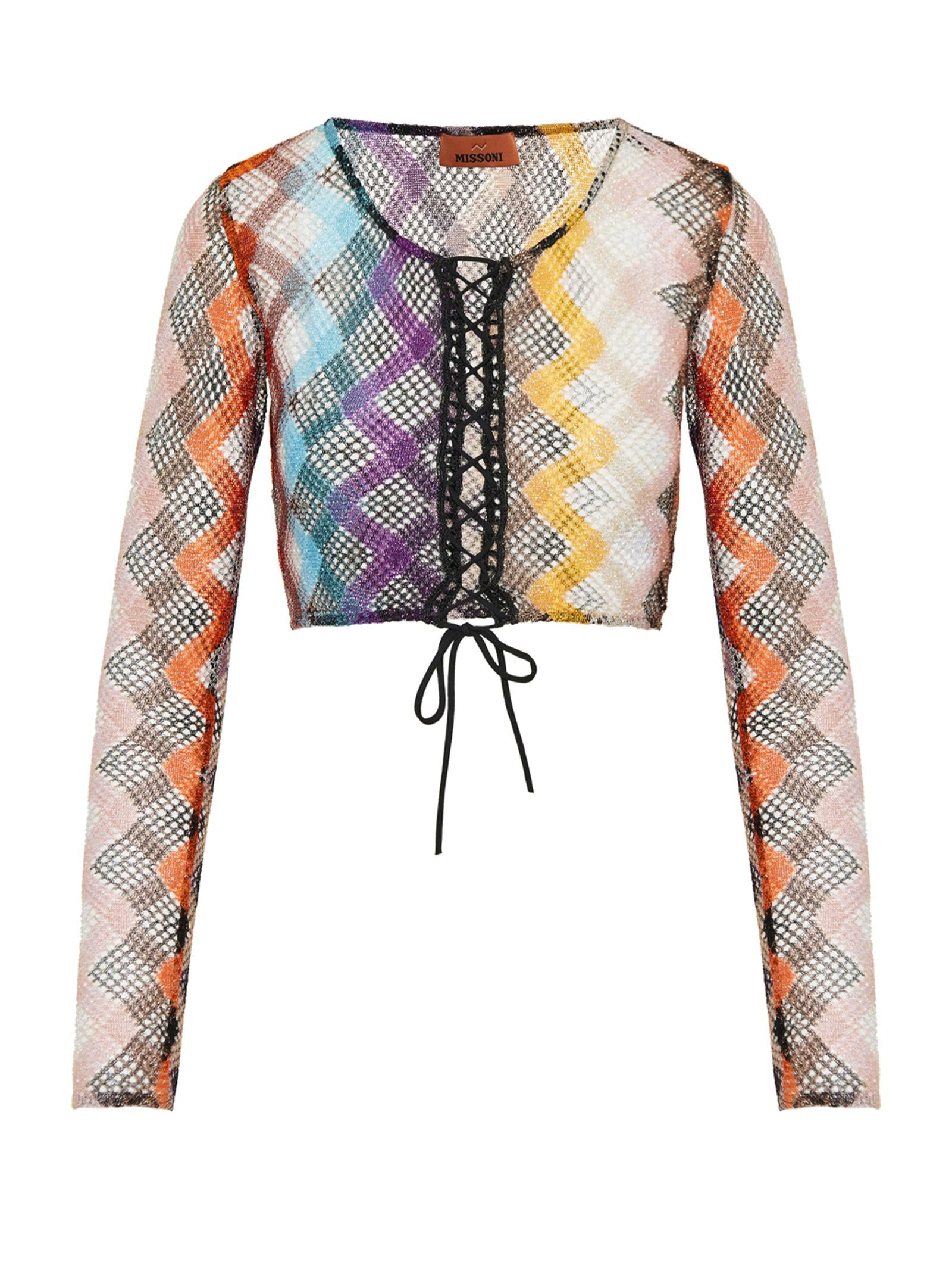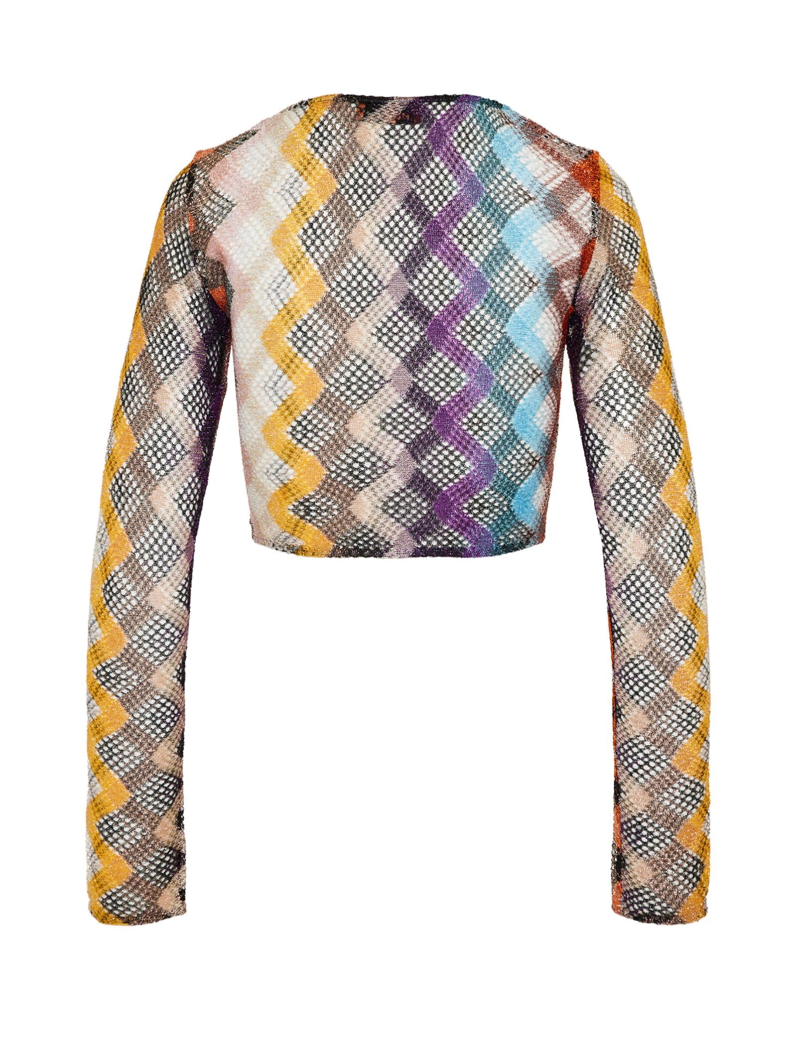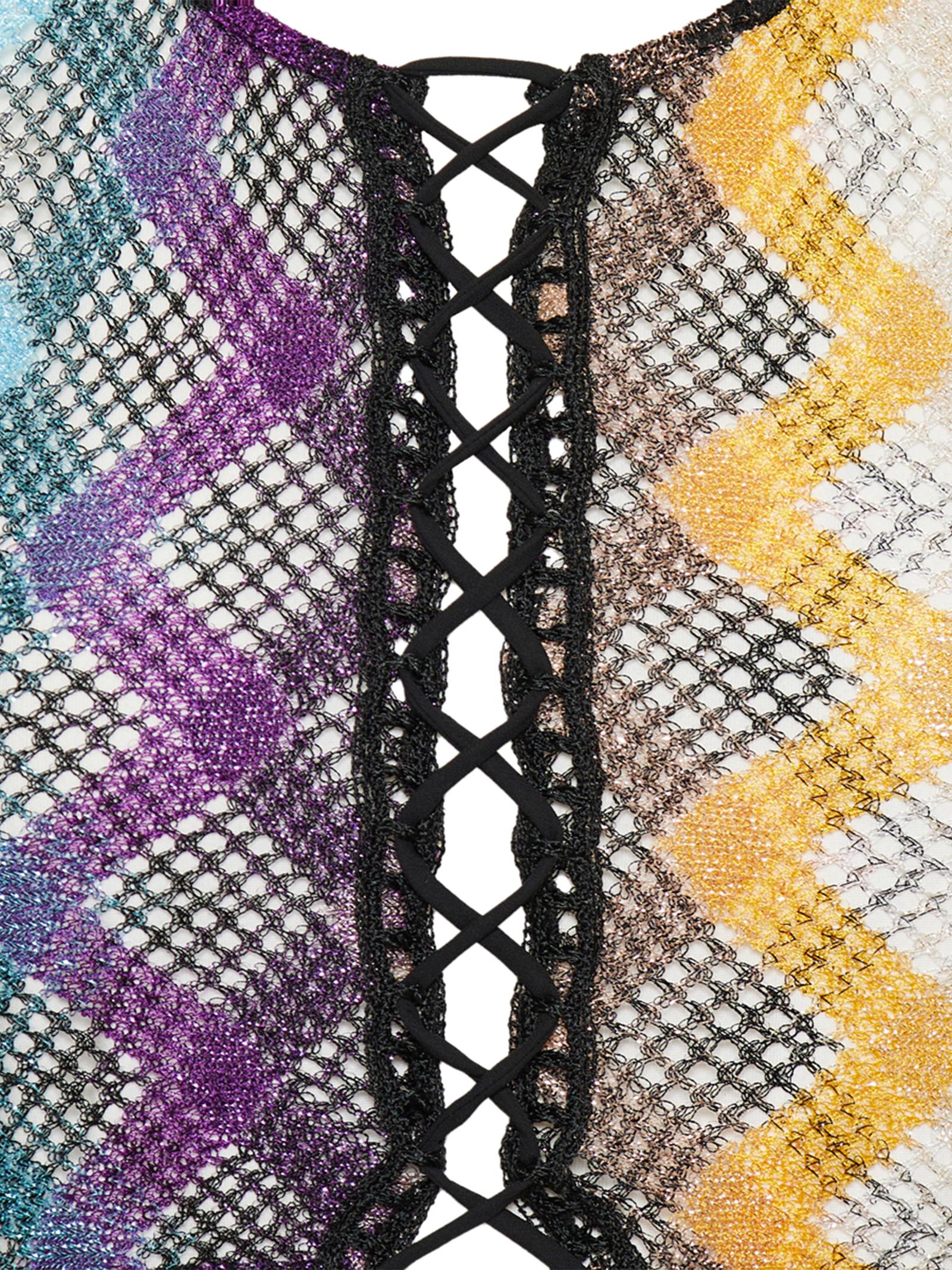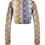 Crop Top a manica lunga dalla lavorazione raschel rigata e motivo a zig zag che combinati con la rete, conferiscono texture al design, mentre l'allacciatura centrale e lo scollo a U valorizzano una silhouette femminile e moderna.Istruzioni per il lavaggio: Non lavare; Stirare a temperatura massima 110 °C; Lavare a secco in tetracloroetilene; Non trattare con cloro; Non usare asciugatrice.Composizione: 73% VISCOSA, 14% FIBRA METALLIZZATA, 13% POLIAMMIDEMade in Italy