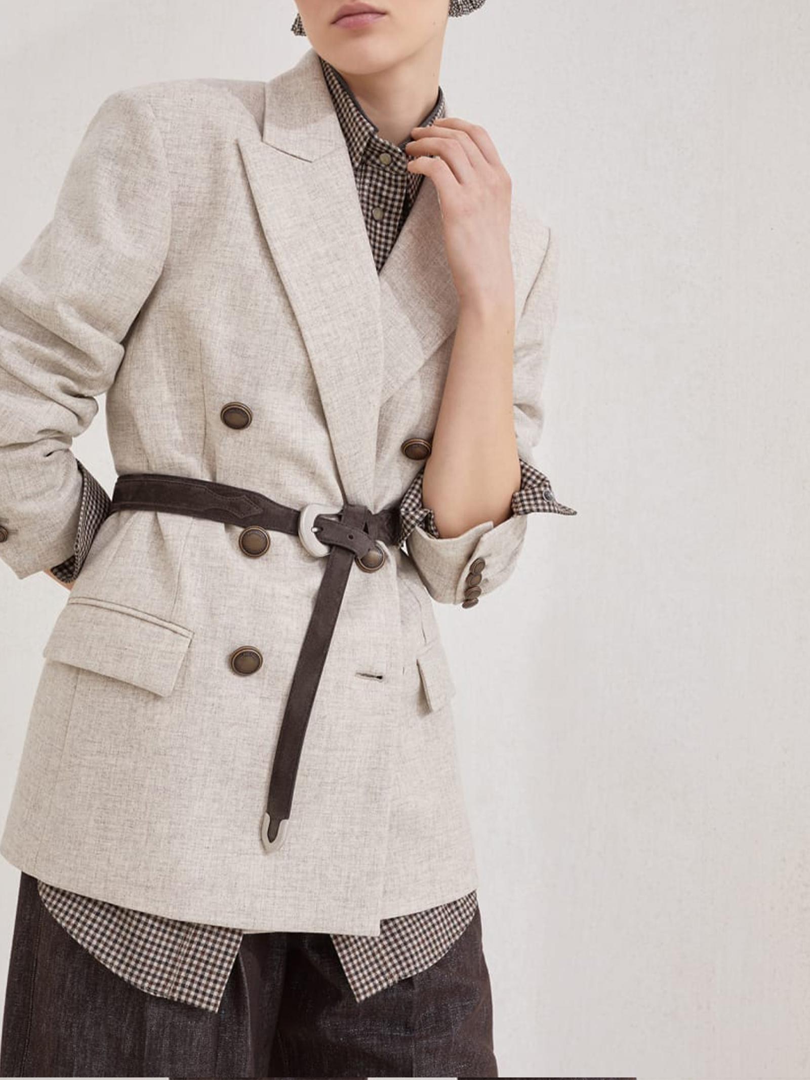 Materiali pregiati e dettagli preziosi si uniscono nella nuova giacca in flanella twill di lana vergine e cashmere. Gli importanti rever a lancia, la chiusura doppiopetto con bottoni in metallo e le classiche tasche con pattina enfatizzano l'aspetto sartoriale del modello, interpretato in una chiave femminile e sofisticata. Il pregiato tessuto, morbido e avvolgente, dona una piacevole sensazione di calore, mentre un delicato ricamo in brillante monile Nickel-free, decorazione iconica delle collezioni Brunello Cucinelli, completa la giacca con una raffinata nota di luce.La flanella twill di lana vergine e cashmere si distingue per linconfondibile armatura diagonale, che conferisce struttura e resistenza al tessuto. La mano è straordinariamente morbida e avvolgente, regalando una sensazione di calore e comfort all'indosso.Presenta inoltre fodera in crêpe misto seta, taschino sul petto, polsini con quattro bottoni in metallo e spacco singolo sul retro.Istruzioni per il lavaggio: Per la pulizia richiedere ai centri specializzati esclusivamente il lavaggio a secco, non candeggiare. Non usare l'asciugatrice, stirare a bassa temperatura.Composizione: 95% LANA VERGINE, 5% CASHMEREMade in Italy