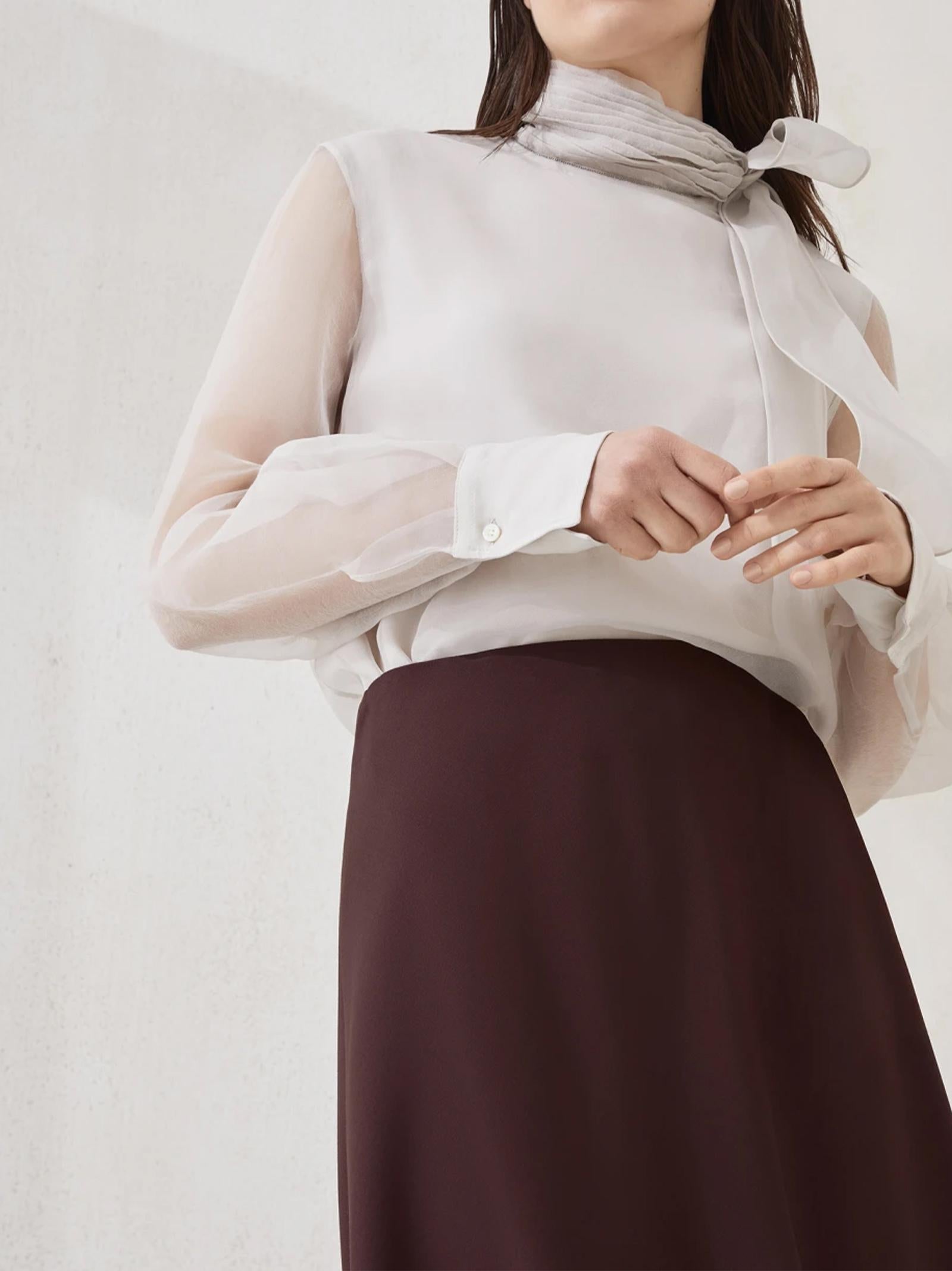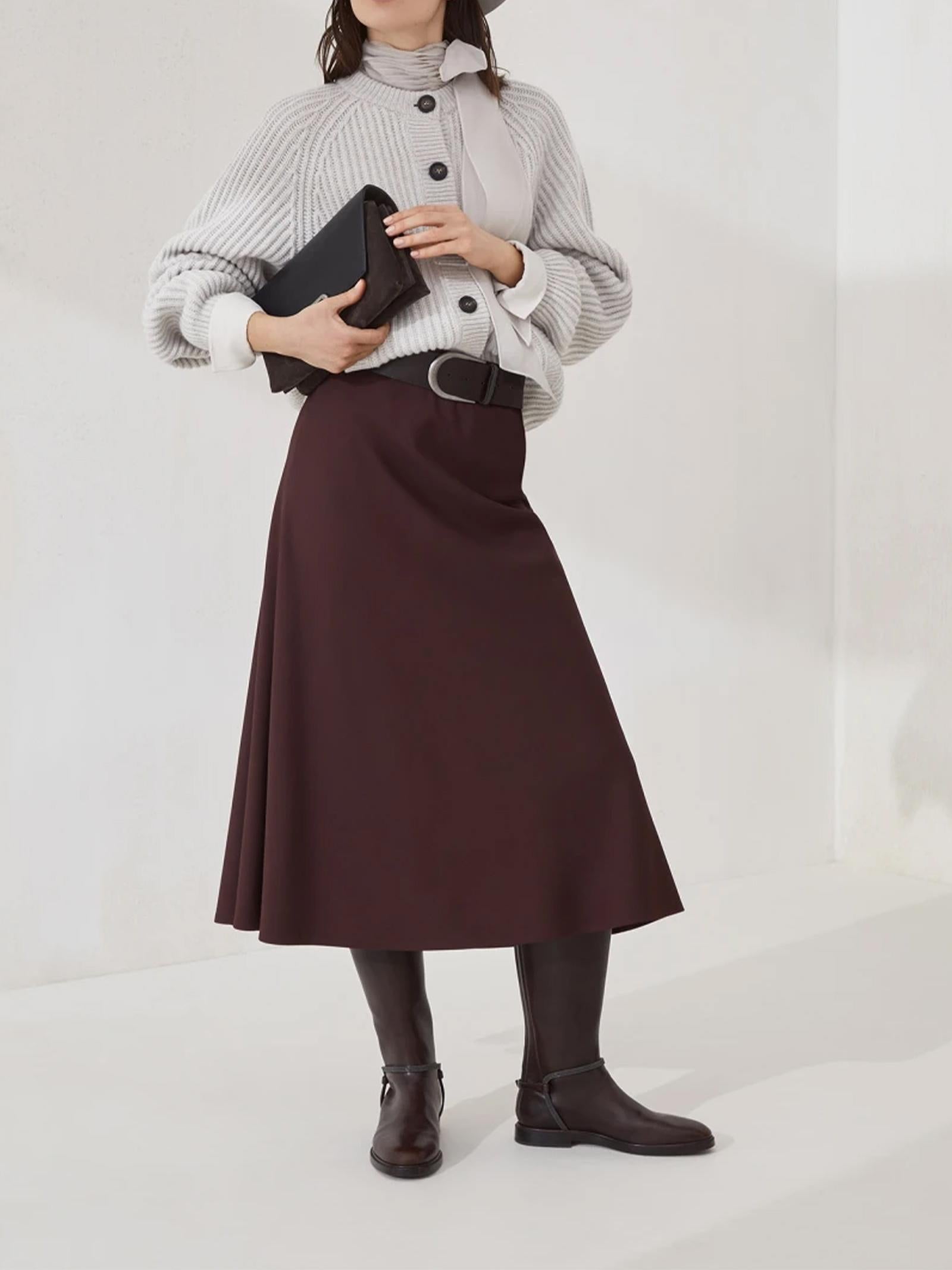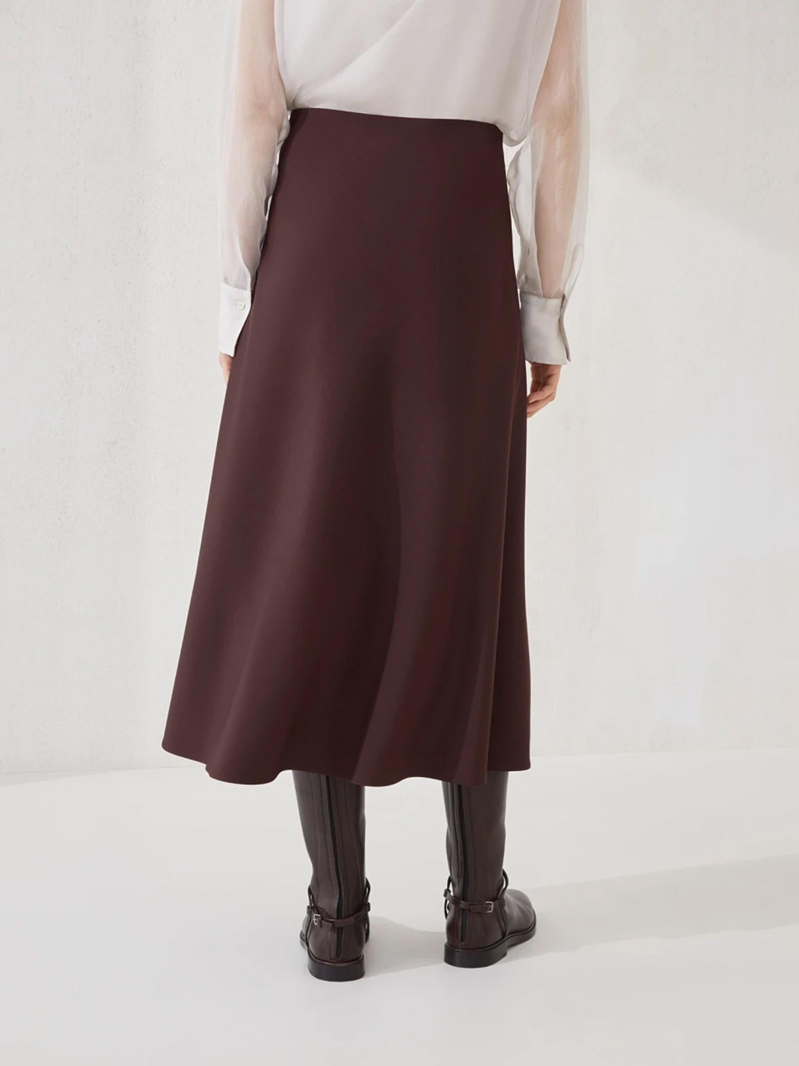 Un'estetica essenziale e raffinata definisce lo stile della gonna Flute in twill di lana vergine e viscosa comfort. La texture liscia e fluida del modello mette in risalto la silhouette affusolata dal gusto femminile. La vestibilità si sviluppa con volumi ampi sul fondo per un effetto lievemente svasato, mentre la chiusura pull-up agevola il comfort all'indosso.L'inconfondibile trama diagonale del twill conferisce al capo una superficie leggermente texturizzata e un aspetto raffinato. La combinazione tra le pregiate fibre di lana vergine e le fibre in viscosa comfort dona una sensazione piacevole all'indosso e una vestibilità impeccabile.Istruzioni per il lavaggio: Per la pulizia richiedere ai centri specializzati esclusivamente il lavaggio a secco, non candeggiare. Non usare l'asciugatrice, stirare a bassa temperatura.Composizione: 76% LANA VERGINE, 22% VISCOSA, 2% ELASTANMade in Italy