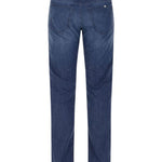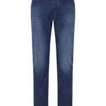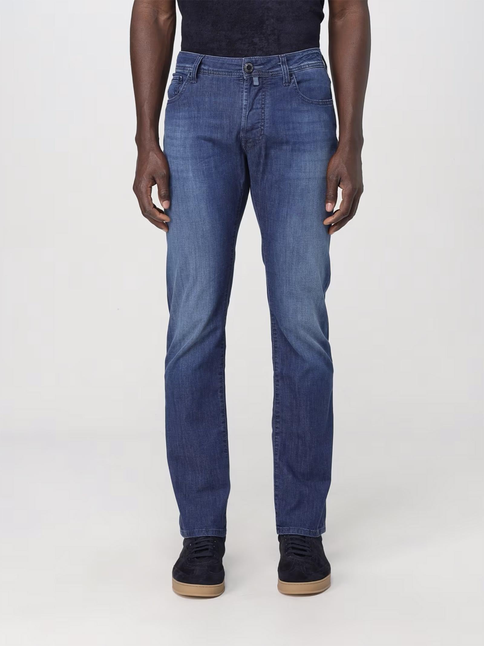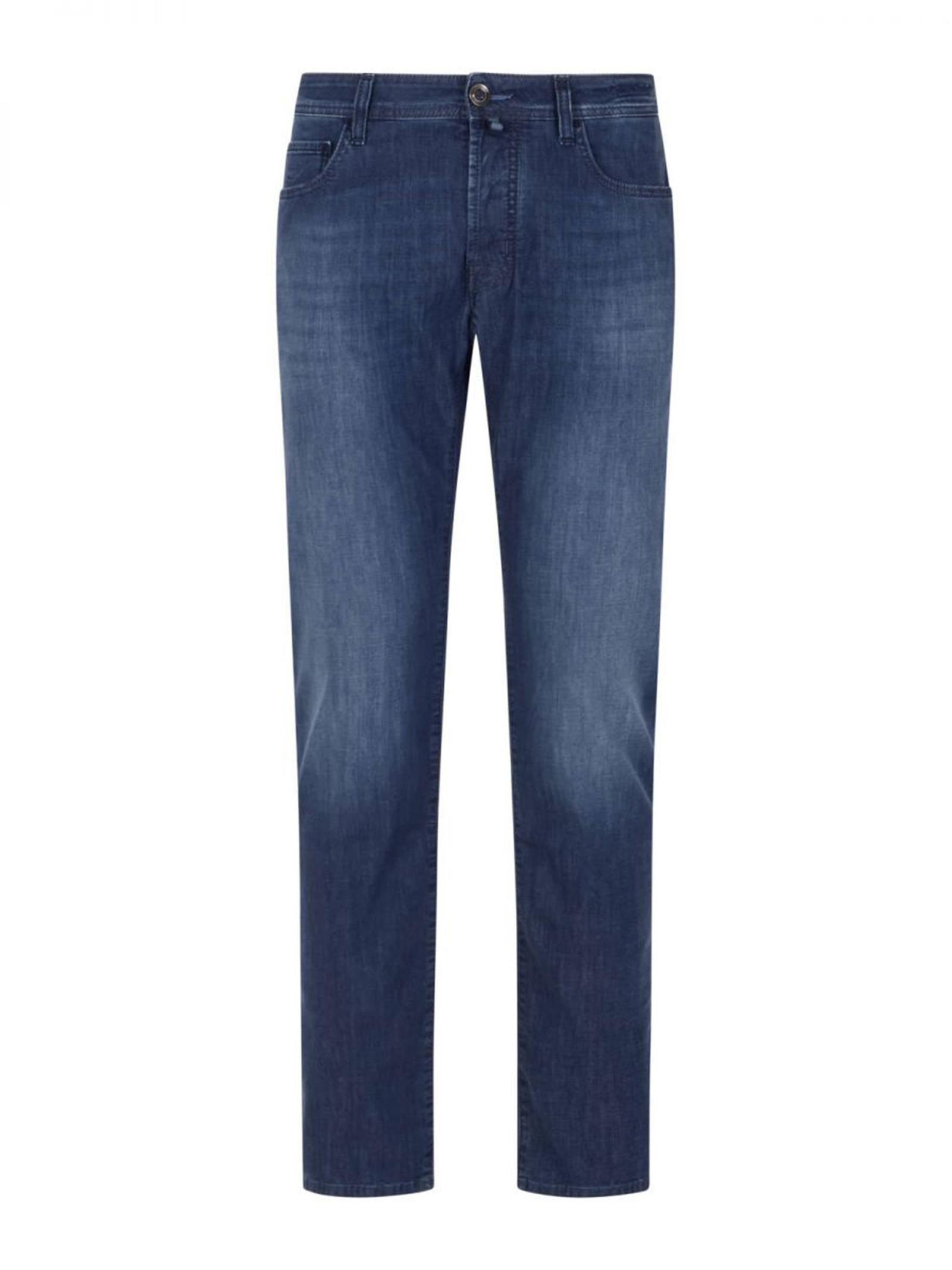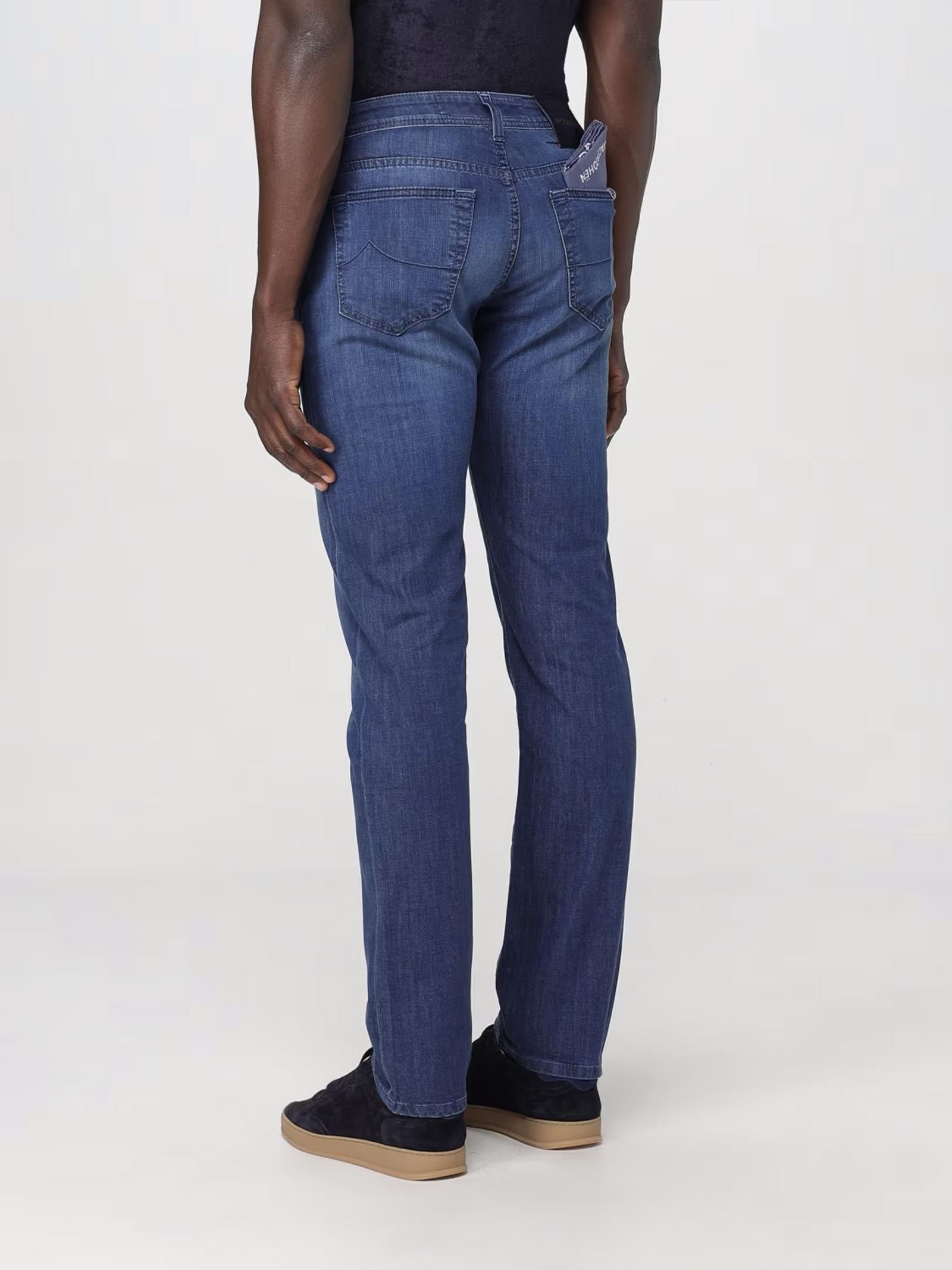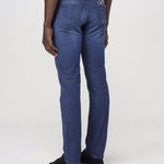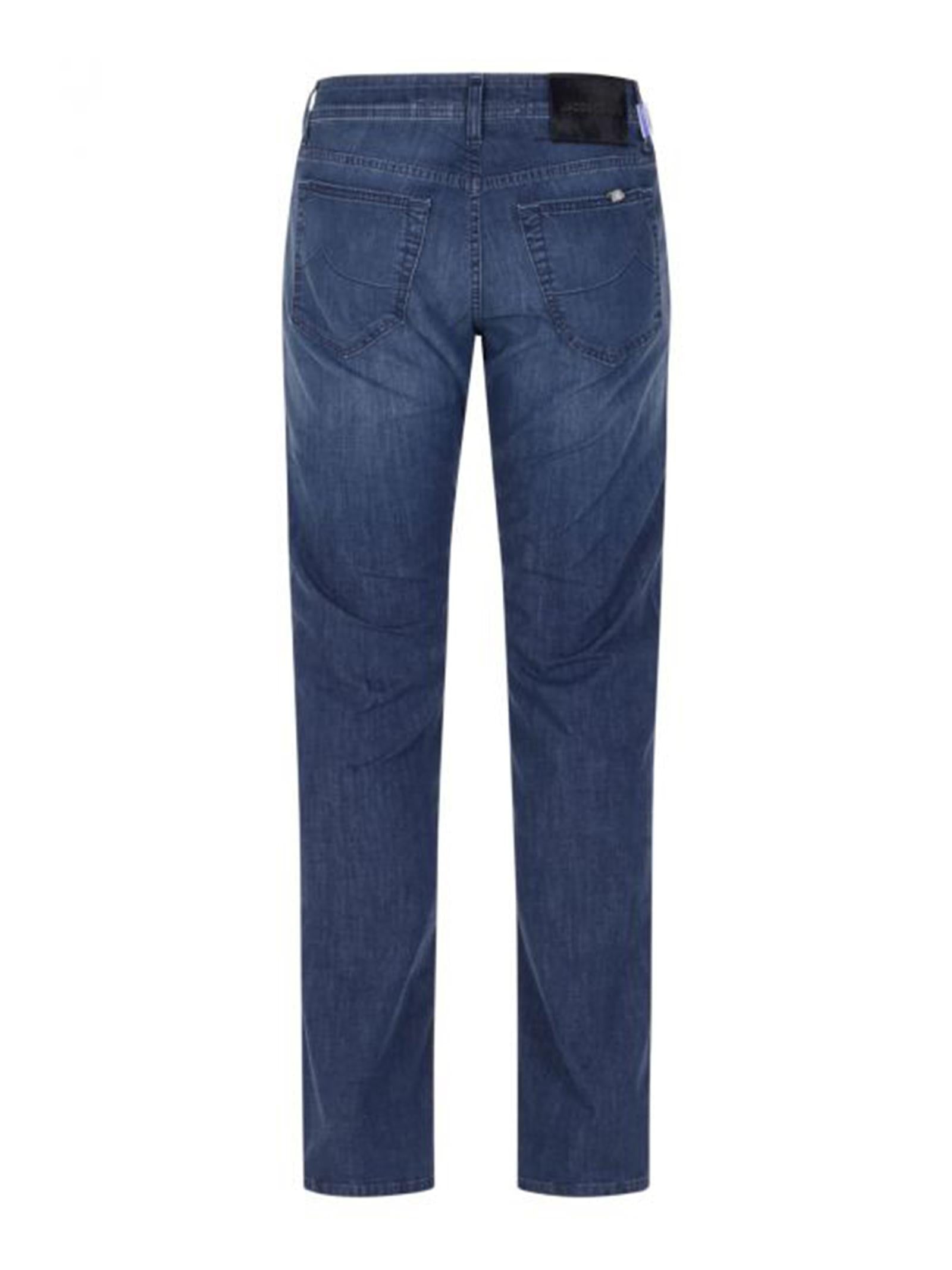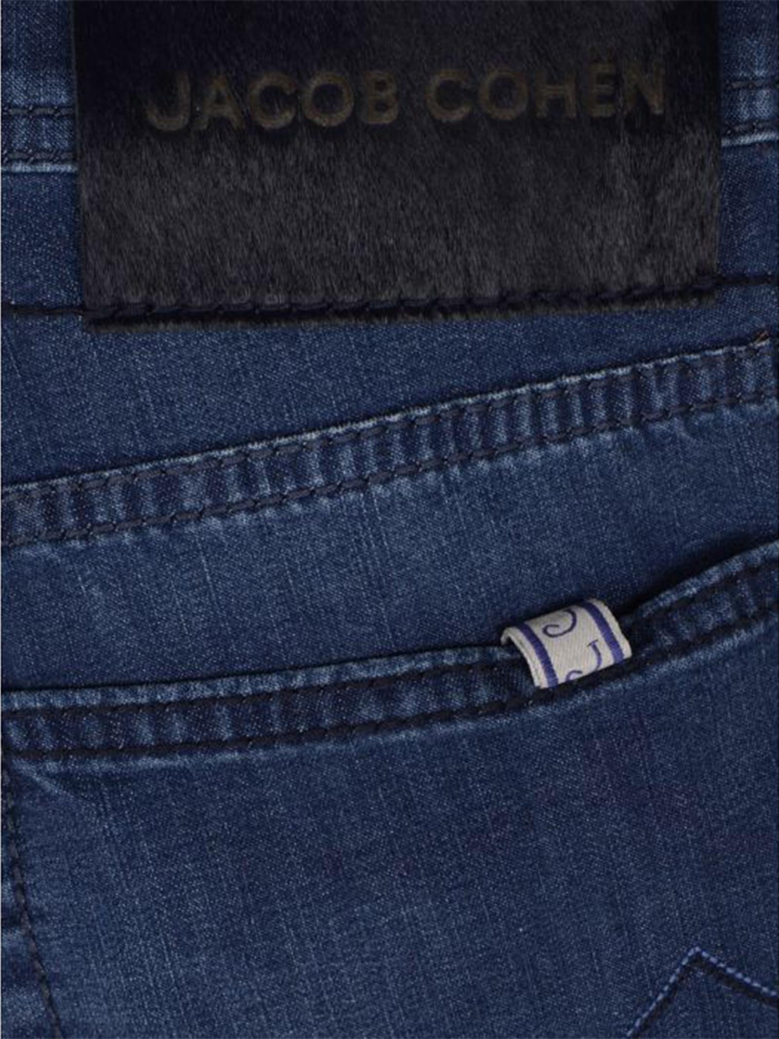 Jeans 5 tasche modello Bard regular-slim fit a vita media. Realizzati in denim di cotone comfort blu con lavaggio bleach, baffature, sabbiatura a mano, spazzolatura totalmente a mano e texture morbida. Presenta salpa in pelle marrone con stampa logo, chiusura con bottone e zip, passanti per cintura in vita, orlo dritto.Include bandana e rocchetto filo.Patta interna ricamata con nome del pantalone e citazione del fondatore, logo ricamato sul taschino.Inoltre profumati con l'esclusiva fragranza Jacob Cohën.Composizione: 72% COTONE, 14% VISCOSA , 2% POLIESTERE, 2% ELASTANMade in Italy