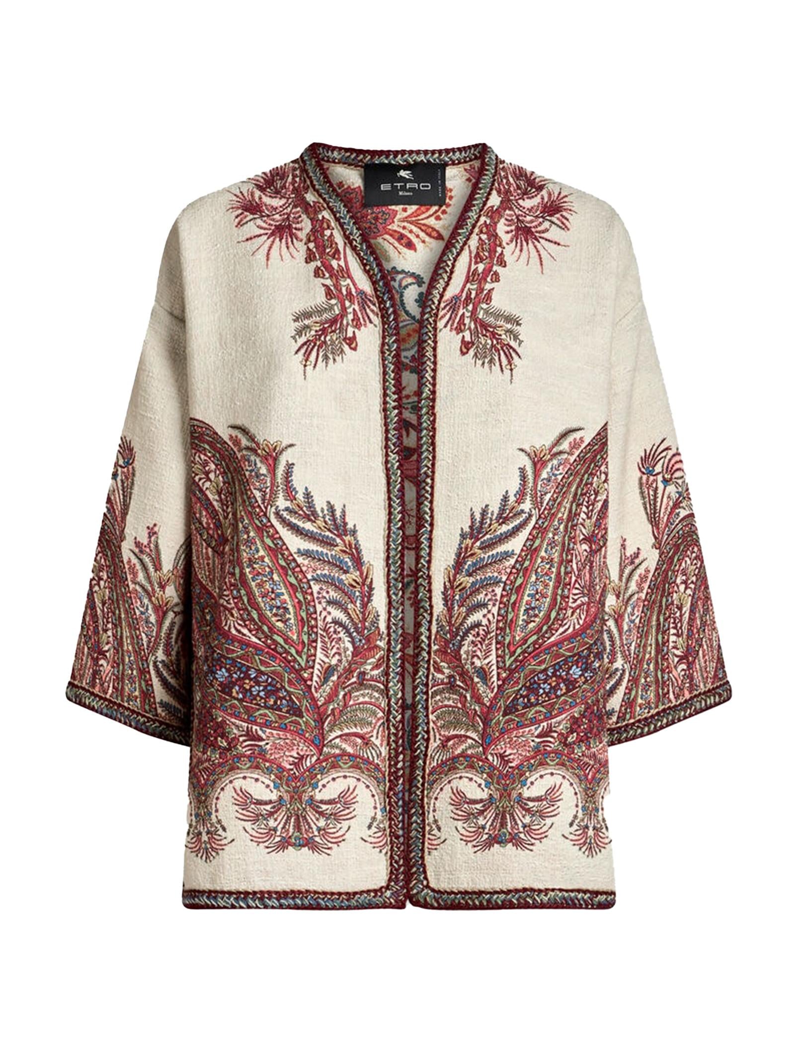 Kesa corta in tessuto bouclé caratterizzata da un motivo Paisley floreale piazzato. Il capo è completato da passamaneria con un motivo intrecciato a contrasto. Caratterizzato da una vestibilità regolare e maniche a kimono.Composizione: 100% POLIESTEREDettagli: 49% VISCOSA, 19% LANA, 19% ACRILICO, 13% COTONEMade in Italy