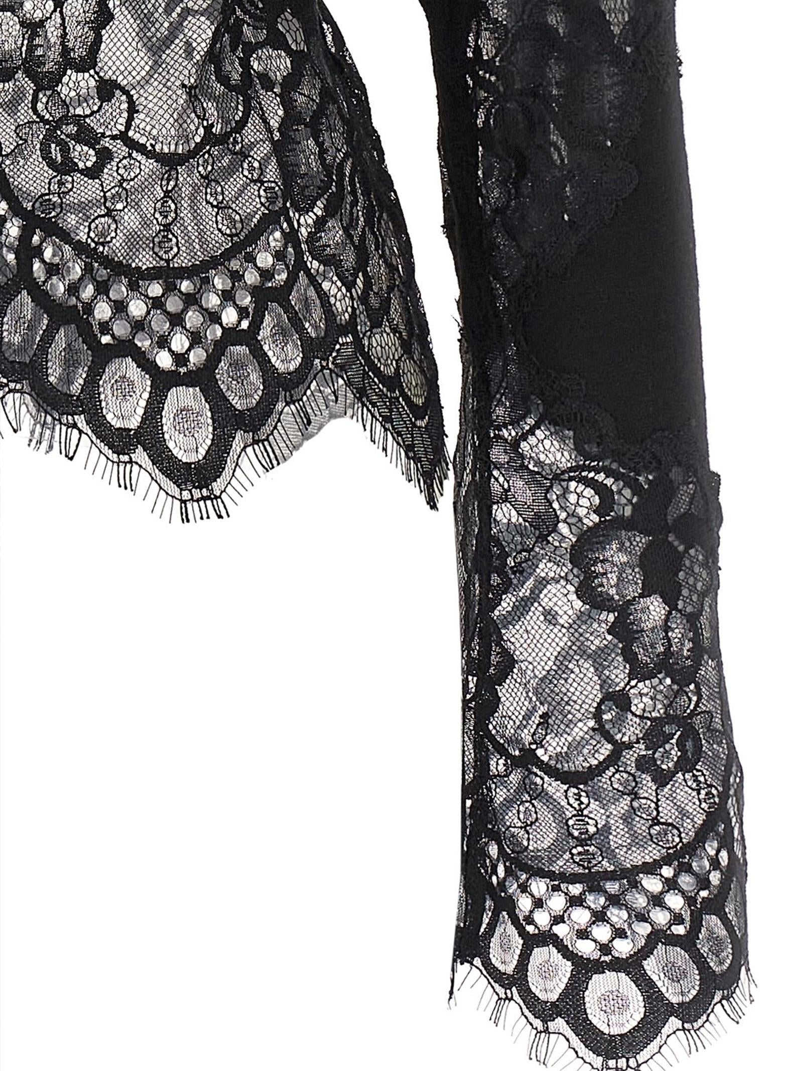 Maglia nera in lana merino con inserti in pizzo semitrasparente, silhouette a clessidra, collo alto, manica lunga svasata, fondo capo asimmetrico.Composizione: 100% LANA MERINOMade in Italy