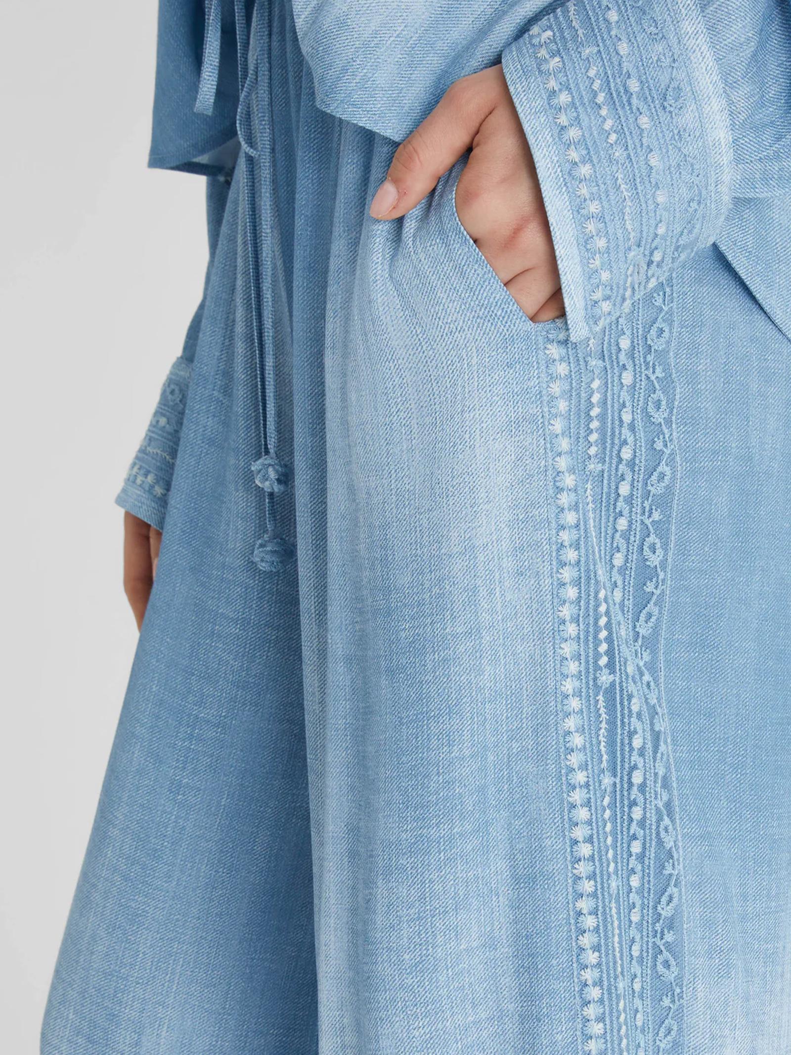 Pantalone palazzo in tessuto marocain con stampa denim azzurro chiaro, versatile nell'abbinamento di ogni look: La vestibilità del capo è confortevole grazie alla coulisse elasticizzata in vita. Presenta tasche a soffietto ai lati, dettagli con pince e motivo con ricamo.La vestibilità è over, si consiglia di acquistare una taglia inferiore rispetto a quella abituale.Istruzioni per il lavaggio: Lavare solo a seccoComposizione: 100% VISCOSA / RAYONMade in Italy