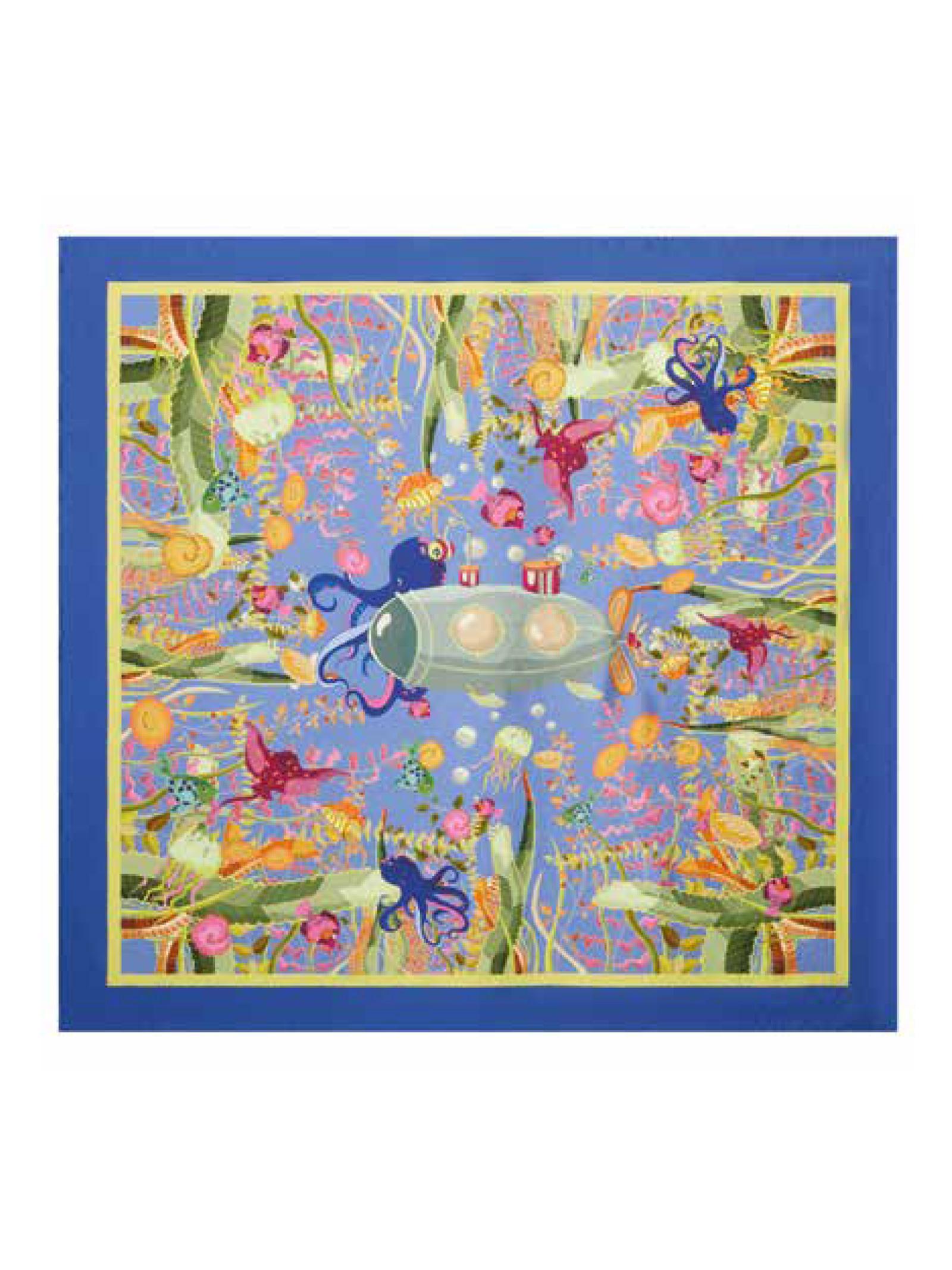 Foulard quadrato in seta 90x90 con orlo arrotolato a mano. Stampa sottomarino.Istruzioni per il lavaggio: solo lavaggio a seccoComposizione: 100% SETAMade in Italy
