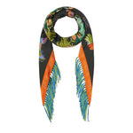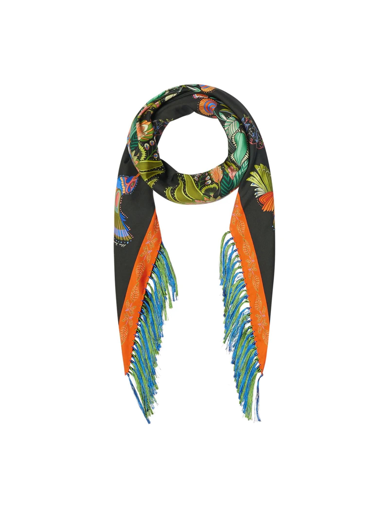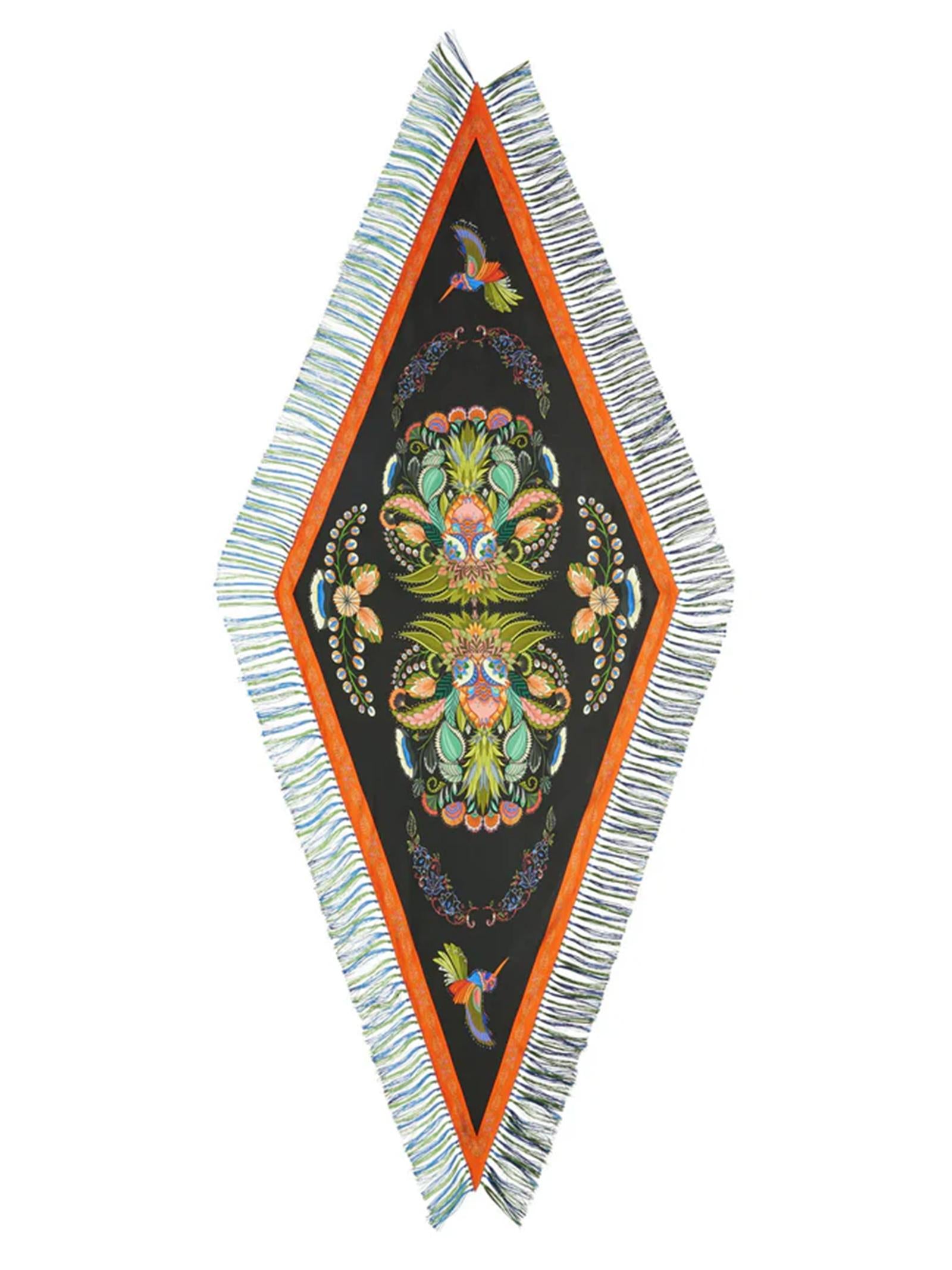 Foulard in seta 65x166 a rombi con frange. Stampa colibrì.Istruzioni per il lavaggio: solo lavaggio a seccoComposizione: 100% SETAMade in Italy
