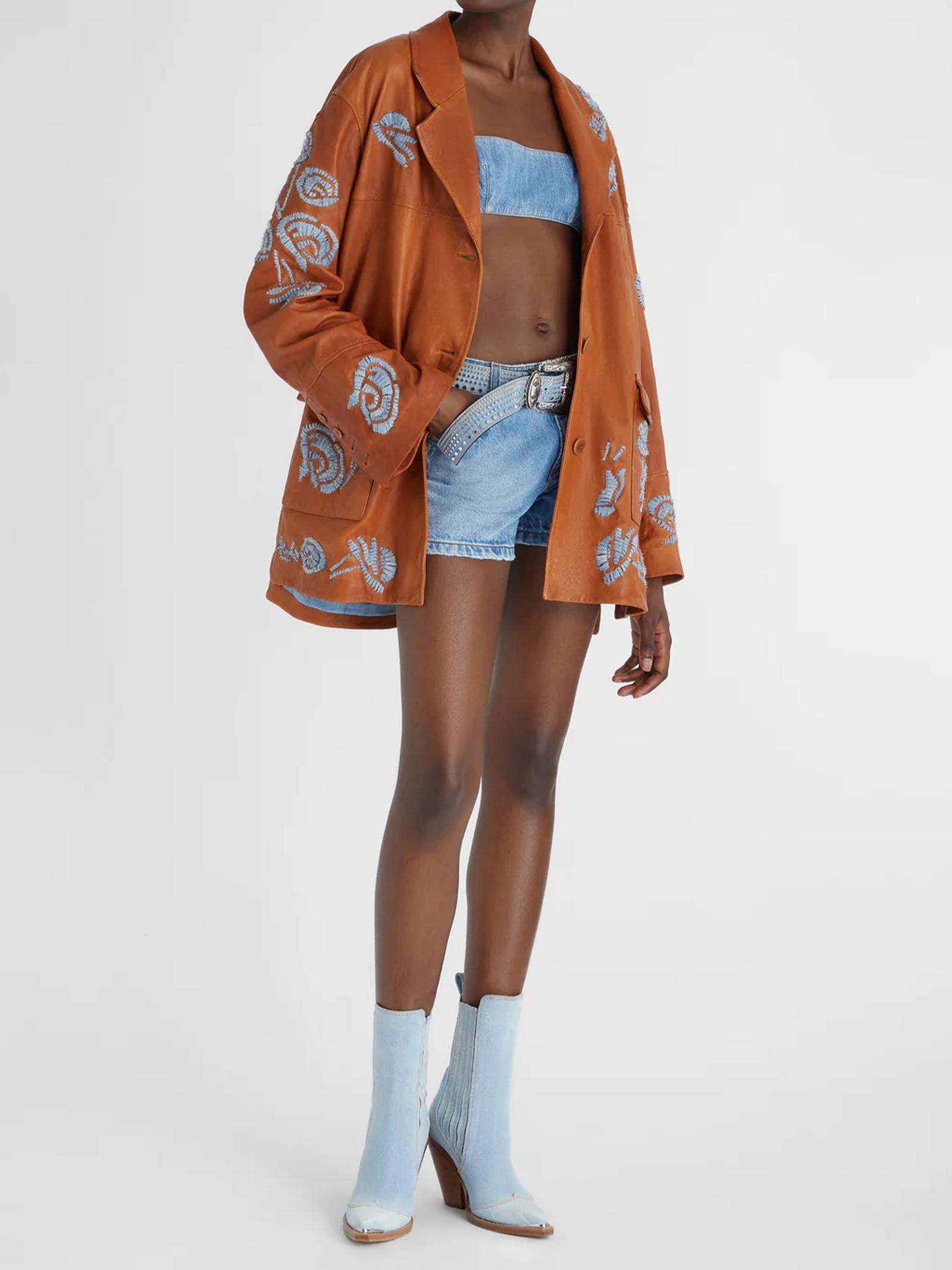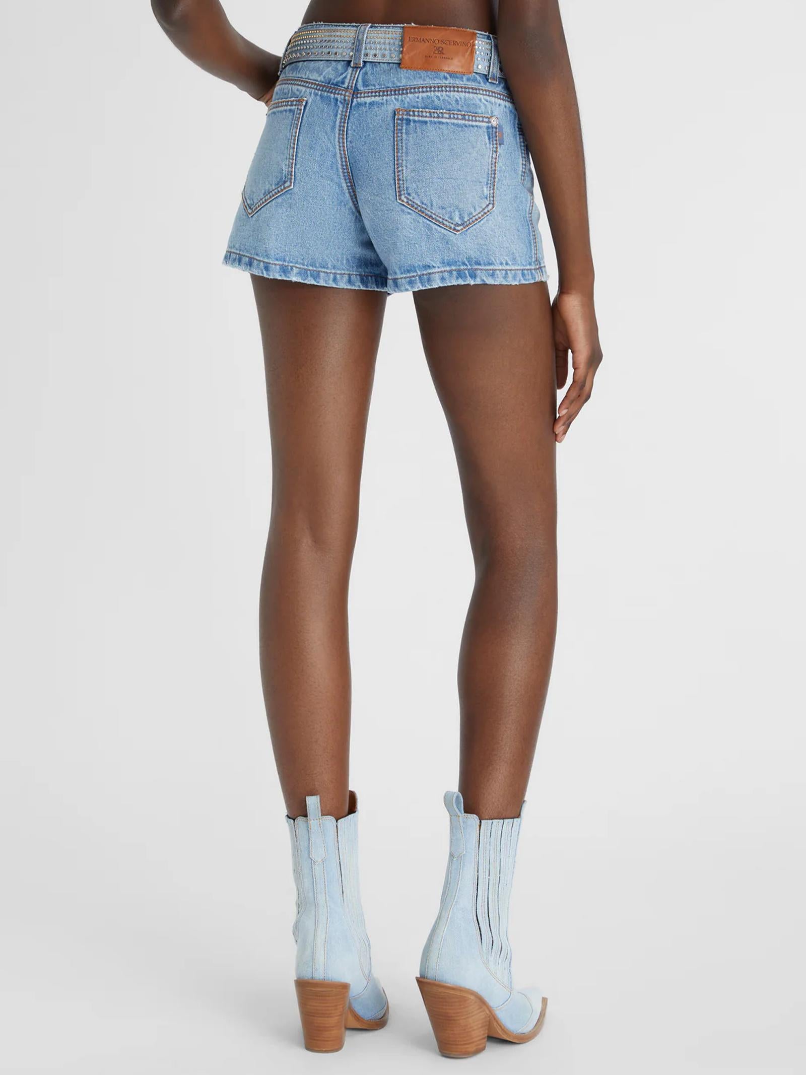 Shorts cinque tasche in jeans con impunture color tabacco. Presenta passanti per cintura, chiusura con zip nascosta e bottone e applicazione posteriore con logo. La vestibilità è regolare.Istruzioni per il lavaggio: Lavare in lavatriceComposizione: 100%COTONEMade in Italy