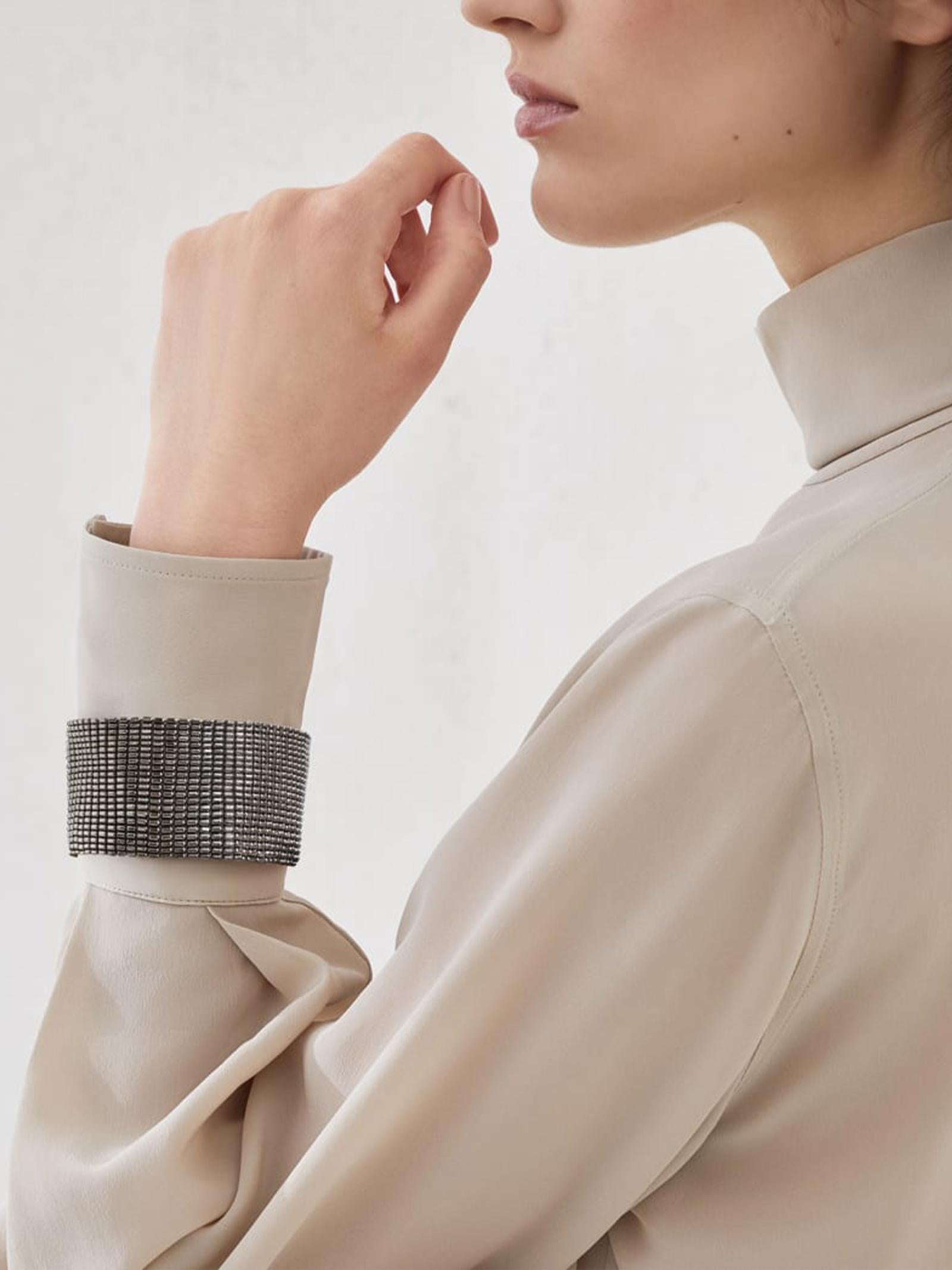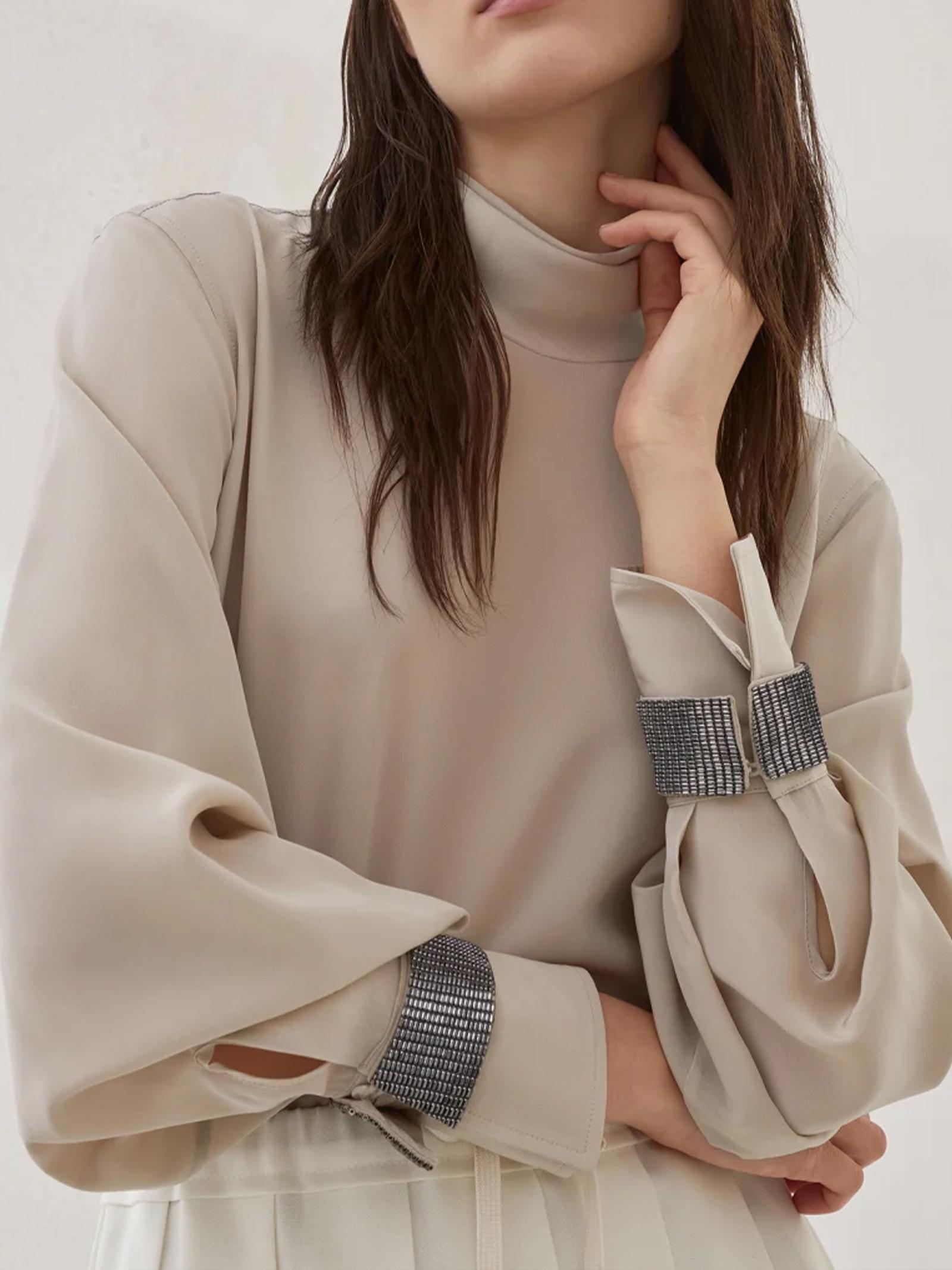 Tessuti pregiati e decorazioni raffinate rinnovano il taglio essenziale della nuova T-shirt a collo alto. Il sofisticato crêpe de Chine di pura seta si caratterizza per una texture leggera e lievemente crespa, che si accorda perfettamente con la silhouette fluida. In particolare la lavorazione con fili ritorti contribuisce a rendere la texture lievemente crespa ed opaca. I luminosi polsini gioiello removibili, realizzati in preziose perline tubolari dall'effetto metallizzato, completano il capo con un accento ricercato ed elegante. Presenta inoltre apertura a goccia con bottone dietro il collo.Istruzioni per il lavaggio: Per la pulizia richiedere ai centri specializzati il lavaggio a secco delicato, non candeggiare. Non usare l'asciugatrice, stirare a bassa temperatura.Composizione: 100% SETAMade in Italy