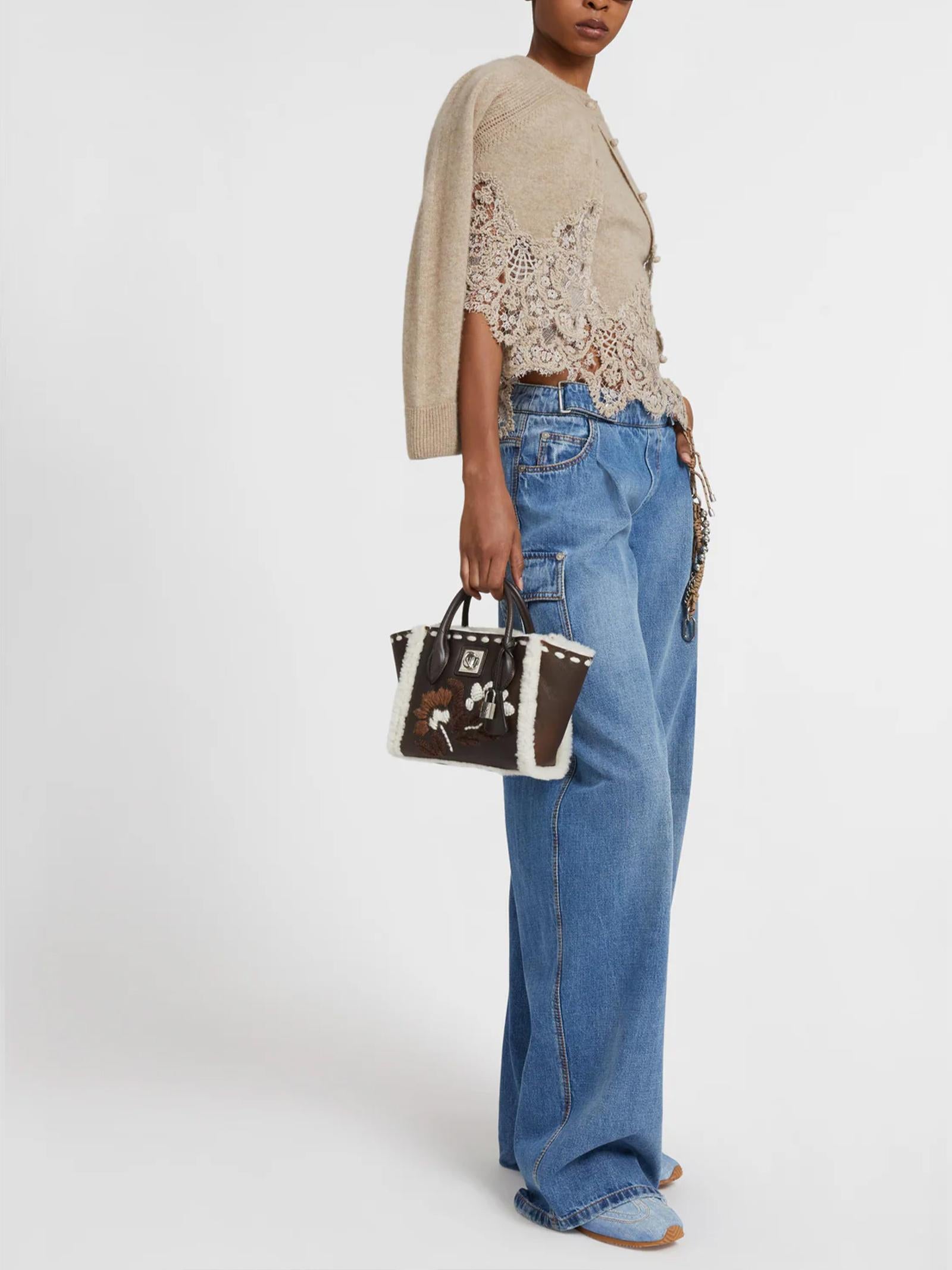Un'eleganza sussurrata, che si rivela nei dettagli più ricercati di questo top in puro cashmere con maniche corte coniugando la preziosità del filato con una lavorazione delicata e raffinata. Il taglio leggermente boxy e cropped dona unattitudine moderna e rilassata, mentre una trama a jour obliqua, posta allaltezza dellattaccatura della manica, crea un gioco di trasparenze che scolpisce la parte superiore con leggerezza e movimento.A impreziosire il fondo del capo, una preziosa incrostazione in pizzo rebrodé di lana, applicata a mano, crea un raffinato effetto vedo-non-vedo che aggiunge un tocco di femminilità e sofisticazione artigianale. Un top che unisce equilibrio formale e attenzione al dettaglio, pensato per look eleganti dal gusto contemporaneo.Composizione: 100% CASHMEREMade in Italy