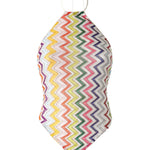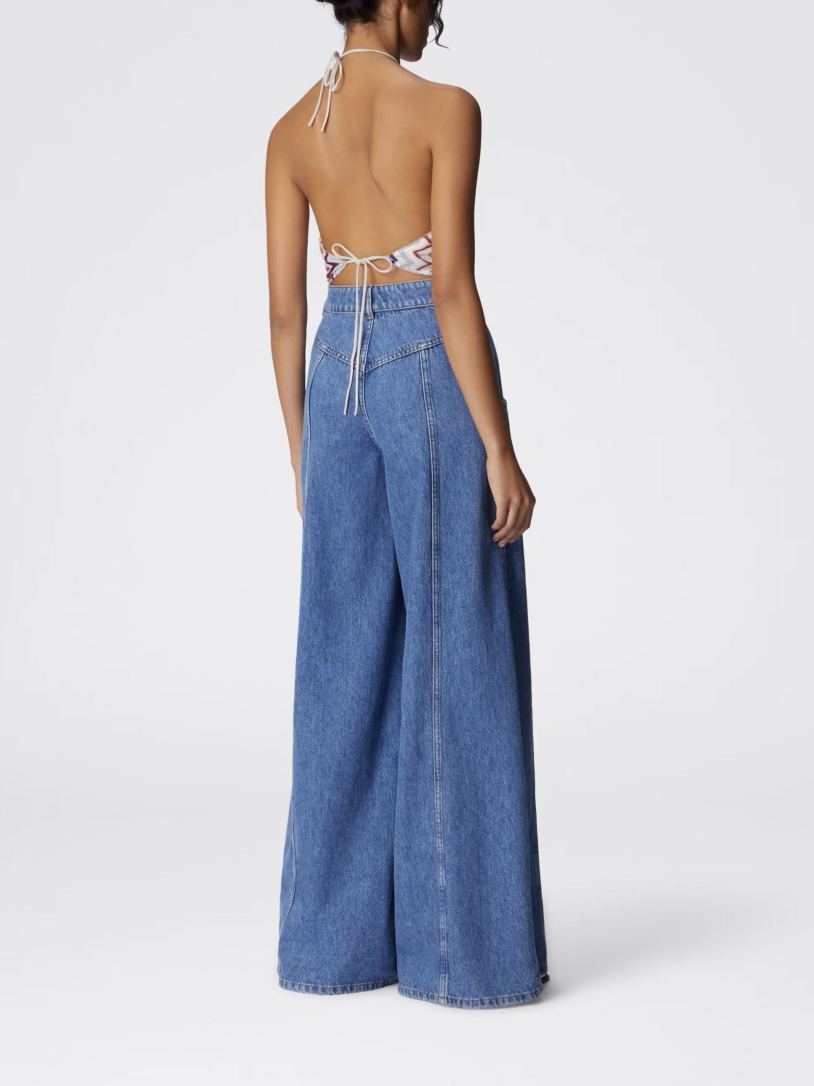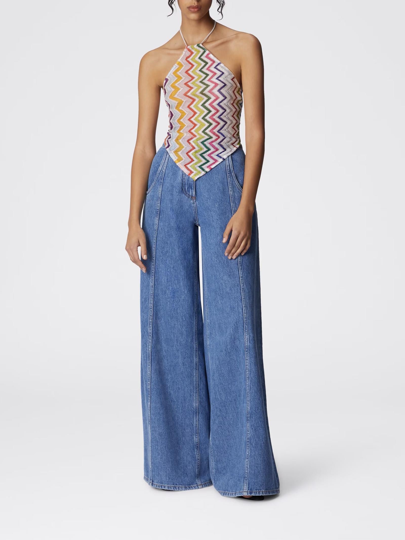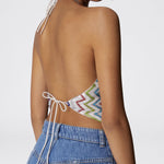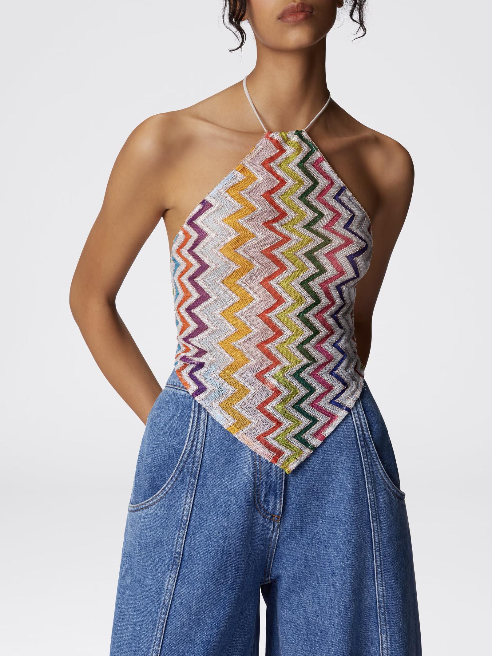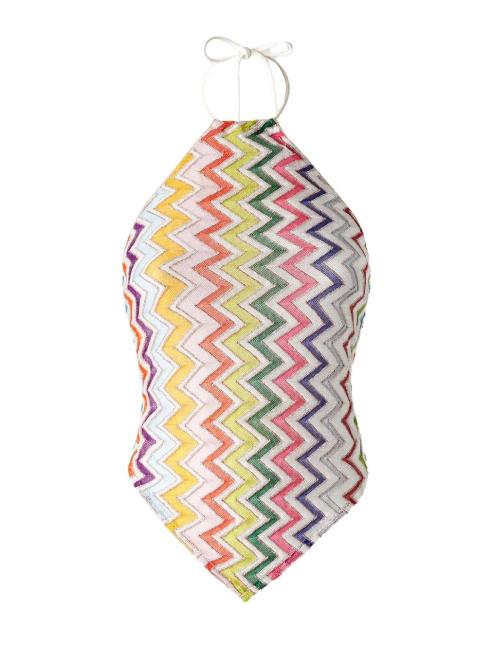 La silhouette quadrata con scollo all'americana e la schiena scoperta donano un appeal seducente, mentre l'iconico motivo zig zag con dettagli in lamé aggiunge luminosità e stile. L'allacciatura dietro al collo completa il design con una nota di personalizzazione.Istruzioni per il lavaggio: Non lavare; Stirare a temperatura massima 110 °C; Lavare a secco in tetracloroetilene; Non trattare con cloro; Non usare asciugatrice.Composizione: 60% VISCOSA, 25% POLIESTERE, 15% FIBRA METALLIZZATAMade in Italy