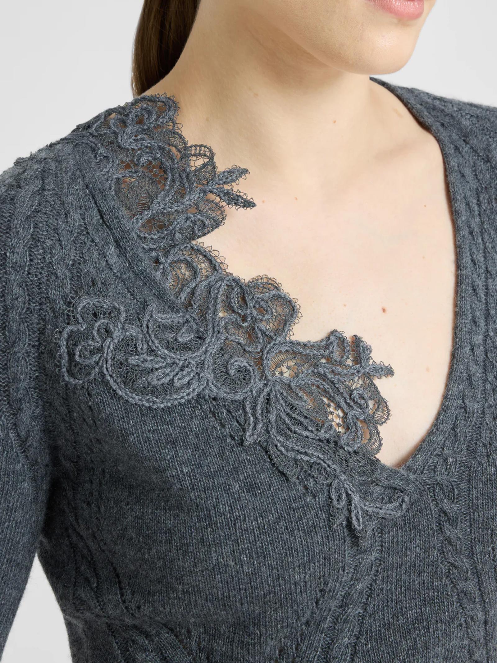 Coniuga la morbidezza del filato pregiato a una costruzione raffinata, questo top grigio scuro a maniche a 3/4 è pensato per valorizzare la silhouette con equilibrio e grazia. Realizzato in misto lana e cashmere, è definito frontalmente da un motivo a treccia obliqua che segue le linee del corpo. A rendere unico il capo è l'applicazione in pizzo ricamato a Cornely, che si sviluppa dalla spalla destra lungo lo scollo a V frontale, per un tocco artigianale dall'eleganza discreta.Composizione: 40% LANA, 30% VISCOSA/RAYON, 20% POLIAMMIDE/NYLON, 10% CASHMEREMade in Italy