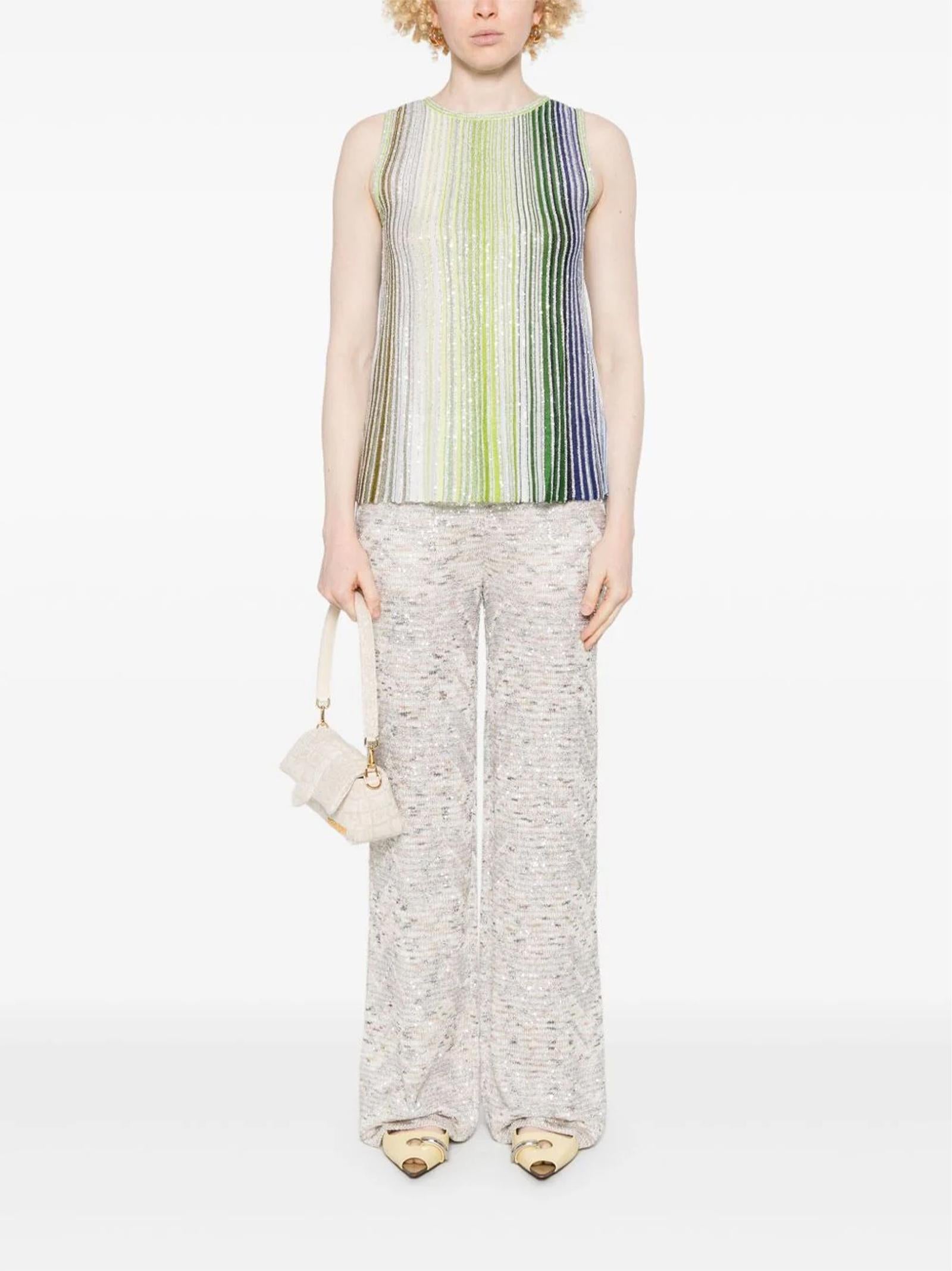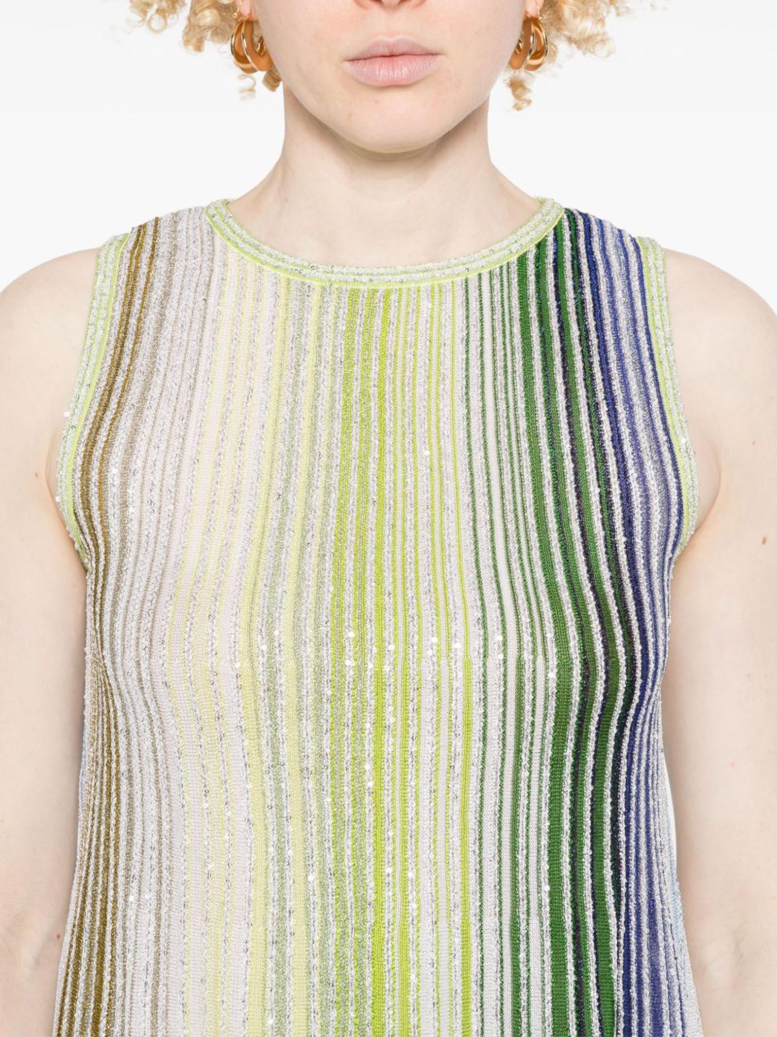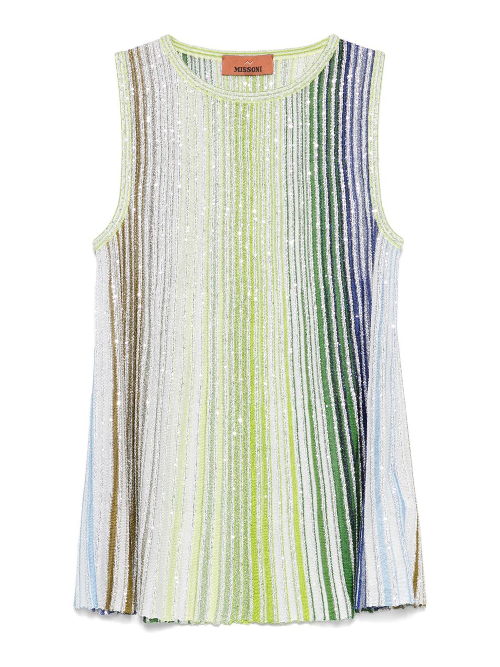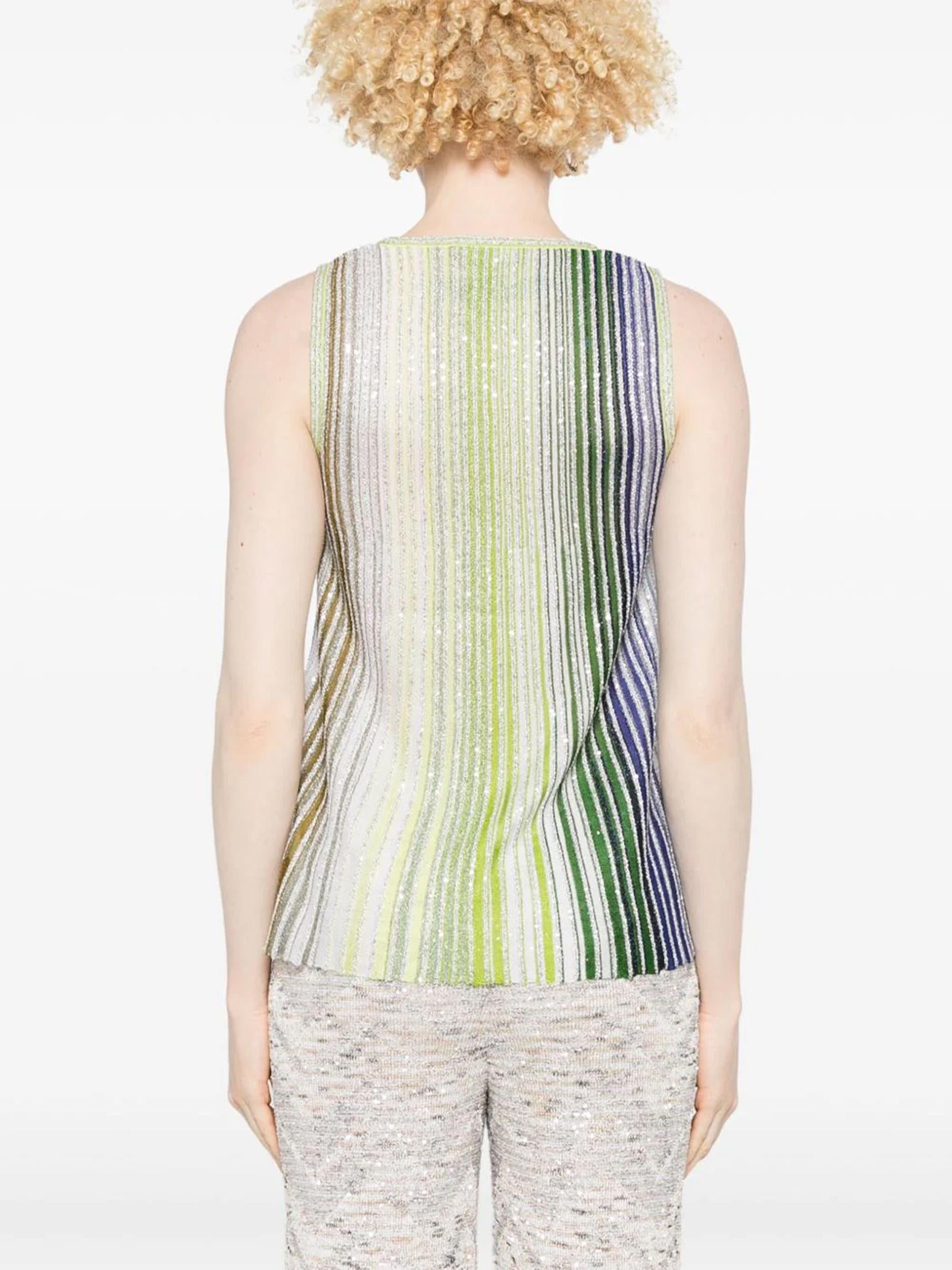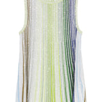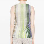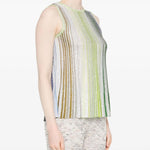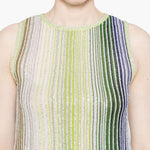 Canotta girocollo a righe in misto viscosa lamé verde/bianco/blu con motivo a righe, paillettes applicate, silhouette senza maniche ed effetto plissettato.Istruzioni per il lavaggio: Non lavare; Lavare delicatamente a secco in tetracloroetilene; Asciugare in piano; Stirare a temperatura massima 110 °C; Asciugare al rovescio; Non trattare con cloro; Stirare a rovescio; Non usare asciugatrice.Composizione: 41% VISCOSA, 21% FIBRA METALLIZZATA,19% POLIAMMIDE,19% POLIESTEREMade in Italy